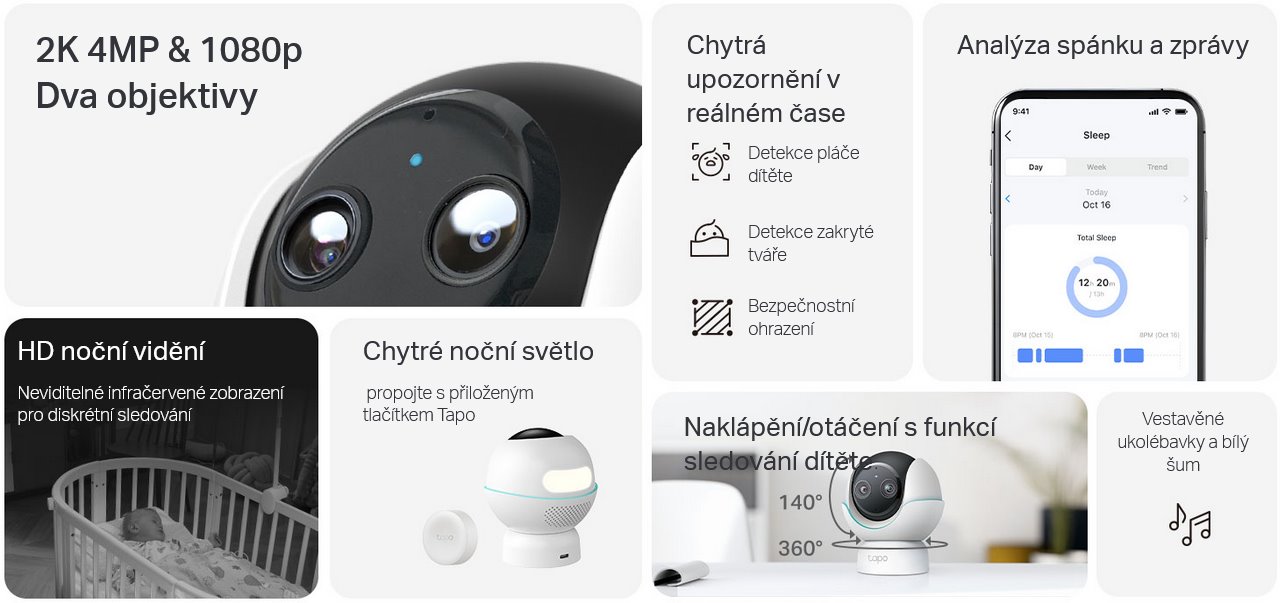 Kamera nabízí inteligentní sledování pohybu, takže i když se vaše dítě pohybuje, zůstane vždy v záběru. Kromě toho technologie detekce pláče dítěte okamžitě rozezná, kdy vaše dítě potřebuje vaši pozornost, a zašle vám upozornění. Pokud je obličej dítěte zakrytý, kamera vás okamžitě informuje, aby bylo zajištěno maximální bezpečí.