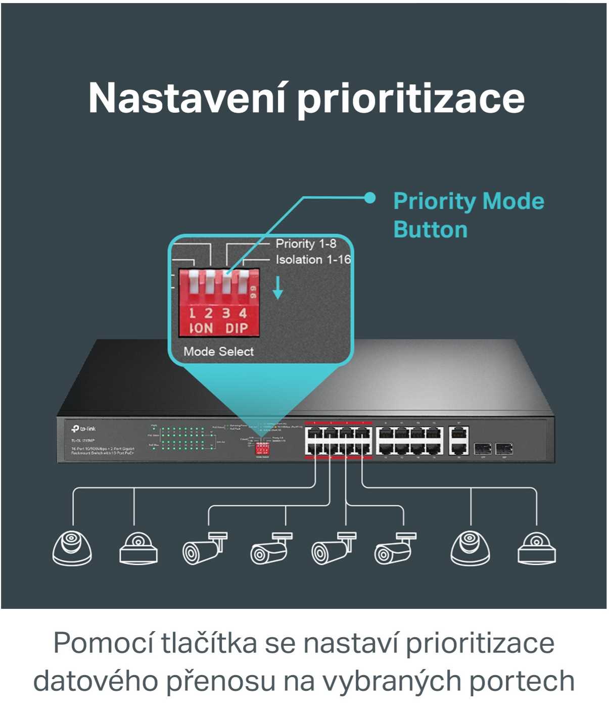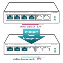 TP-Link PoE Switch TL-SF1006P je nemanagovatelný PoE Switch s 6x 10/100Mbps z čehož pouze 4 porty podporují PoE-Out se standardem 802.3af/at (až 30 W / port). Celkový PoE budget switche je 67 W. Switch umožňuje i PoE na vzdálenost 250 m při přepnutí speciálního přepínače, který způsobí ponížení linkové rychlosti na PoE portech na 10 Mbps, což pro přenos obrazu z kamer bohatě stačí. Dalším bonusem switche jsou prioritní porty a inteligentní Power Management pro případné odpojení PoE zařízení v případě nedostatečného PoE budgetu.
