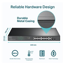 TL-SG1218MP je nemanagovatelný rackmount PoE switch značky TP-Link s 18 Gigabit LAN porty a dvěma combo SFP. Prvních 16 portů má rychlost 10/100/1000Mbps a podporuje 802.3af/at PoE s maximální spotřebou 30 W / port a celkovým PoE budgetem 250 W. Další 2 porty jsou opět Gigabitové, sloužící jako uplink do sítě z čehož oba jsou combo porty s Gigabitovými SFP hned vedle nich.
