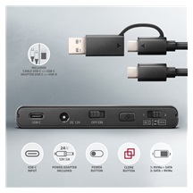 Univerzální USB-C 10Gbps adaptér AXAGON ADSA-CC CLONE MASTER 2 připojí k počítači snadno a rychle až dva disky současně. Jakýkoliv 2.5" nebo 3.5" disk snadno připojíte přímo k externímu SATA konektoru adaptéru. NVMe M.2 disk jednoduše vložíte do těla adaptéru bez použití šroubováku nebo jiných nástrojů. K adaptéru můžete připojit i SATA M.2 disk s použitím redukce jako je například AXAGON RSS-M2SD. V balení naleznete kabel USB-C <-> USB-C s napevno uchycenou redukcí USB-C -> USB-A. Toto řešení zvyšuje univerzálnost adaptéru, který tak můžete připojit k jakémukoliv USB portu počítače, ať už k oboustrannému USB-C konektoru nebo k tradičnímu USB-A konektoru. Díky funkci klonování bez potřeby připojení k PC lze adaptér využít jako autonomní zařízení pro pohodlné duplikování a vytváření obrazů disků. Směr klonování je nastavitelný pomocí přepínače a můžete si tak snadno zvolit, zda budete klonovat obsah NVMe M.2 disku na SATA disk nebo naopak. Po zkopírování všech dat je na cílovém disku přesná kopie původního disku. Jedná se o nejjednodušší způsob, jak přenést obsah jednoho disku na další disk, a to včetně funkčního operačního systému (Windows, macOS, Linux …). Kromě rychlého rozhraní USB 10Gbps podporuje adaptér také všechny důležité funkce pro bezproblémovou práci s různými typy disků. Jsou to UASP pro rychlejší přenos dat, TRIM pro omezení pozvolné degradace výkonu SSD v čase, S.M.A.R.T. pro monitoring stavu disků, BOOT pro možnost bootování z disků připojených k adaptéru, Auto Spindown pro automatické uspání disků při delší nečinnosti, Turn Off pro vypnutí disků po odebrání zařízení nebo uspání PC a USB Bus Power pro napájení adaptéru včetně připojených M.2 a 2.5" disků jen z USB sběrnice. V případě připojení 3.5" disku je již samozřejmě nutné použít přibalený napájecí adaptér. Uvedené vlastnosti dělají z adaptéru CLONE MASTER 2 velice šikovný a užitečný nástroj pro častou práci s různými druhy disků. Jedná se tak o ideálního pomocníka pro zálohování, migraci, přenos a ukládání dat, testování a klonování disků apod. Vstup: • USB 10Gbps (USB 3.2 Gen 2). • Rychlost až 10 Gbit/s. • Připojení přes reverzibilní USB type C female konektor. Podpora zařízení v M.2 slotu: • NVMe (PCI-Express) M.2 SSD jedno i oboustranné disky. • Podpora M.2 disků o rozměrech 2242, 2260, 2280 mm. • Podpora M-KEY & B+M-KEY NVMe M.2 SSD disků. • Bez omezení kapacity disku. Podpora zařízení připojených k SATA portu: • SATA 2.5"/3.5" HDD/SSD. • SATA M.2 SSD s redukcí M.2 -> SATA např. AXAGON RSS-M2SD. • Bez omezení kapacity disku. Funkce klonování obsahu disku: • Klonování probíhá bez připojení stanice k počítači. • Cílový disk musí mít stejnou nebo větší kapacitu než disk zdrojový, jinak nelze klonování spustit. • Přepínač směru klonování - z NVMe M.2 disku na SATA disk nebo ze SATA disku na NVME M.2 disk. • Rychlost klonování SSD až 500 MB/s. • Celkový čas naklonování disku závisí na kapacitě zdrojového disku, ne na objemu dat na disku. Další vlastnosti: • Kompatibilní s USB 10Gbps (USB 3.2 Gen 2) • Zpětně kompatibilní s USB 5Gbps (3.2 Gen 1 / USB 3.0) a USB 480Mbps (USB 2.0). • Podpora přenosových rychlostí 10.000 / 5.000 / 480 Mbit/s. • Vyhovuje PCI Express Base Specification Revision 3.1a specifikaci. • Vyhovuje NVM Express 1.3c specifikaci. • Celková propustnost / přenosová rychlost adaptéru je dána použitým USB 3.2 Gen 2 rozhraním (teoreticky až 10 Gbit/s). • Reálná propustnost / přenosová rychlost adaptéru kolem 1.000 MB/s (1 GB/s) je dána limity USB 3.2 Gen 2 rozhraní. • Vyhovuje Serial ATA 3.0 specifikaci (SATA/600), přenosové rychlosti až 6 Gb/s (600 MB/s). • Vyhovuje Serial ATA 2.0 specifikaci (SATA/300), přenosové rychlosti až 3 Gb/s (300 MB/s). • Vyhovuje Serial ATA 1.0 specifikaci (SATA/150), přenosové rychlosti až 1.5 Gb/s (150 MB/s). • Vyhovuje USB Mass Storage Class specifikaci. • Podpora UASP (USB Attached SCSI) pro rychlejší přenos dat ve Windows 8.1 a novějších. • Podpora TRIM pro omezení pozvolné degradace výkonu SSD v čase. • Podpora S.M.A.R.T. (Self-Monitoring, Analysis, and Reporting Technology) systém monitorující stav disku. • Podpora bootování z disků připojených k adaptéru. • HDD Auto Spindown - automatické uspání disků při nečinnosti trvající 10 minut. • HDD Turn Off - vypnutí disku po odebrání zařízení nebo uspání PC. • Plná podpora Plug and Play. • Připojení přes USB-C female konektor. • Kabel délky 30 cm USB-C male / USB-C male + USB-C / USB-A redukce součástí balení. • Rozměry adaptéru 102 x 68 x 15 mm. • Hmotnost adaptéru 73 g (bez příslušenství). Napájení: • USB Bus Power - pro M.2 a 2.5" disky stačí napájení po USB sběrnici. • Self Power - pro 3.5" disky je nutné napájení pomocí přiloženého externího AC/DC adaptéru 12V - 2A s kabelem délky 150 cm. • Vypínač napájení. LED indikace: • zelená LED dioda indikuje zapnuté napájení adaptéru (trvalým svitem). • 2x oranžová LED dioda indikuje připojení pro každý z disků (trvalým svitem) a přenos dat (blikáním). • 4x modrá LED dioda indikuje průběh klonování 25%-50%-75%-100% (blikáním), resp. dokončení klonování (trvalým svitem). Podporované operační systémy: • Windows 8.1 / 10 / 11 a novější, • Windows Server 2012 R2 / 2016 / 2019 / 2022 a novější, • Mac OS X 10.x a vyšší, • Linux s jádrem 2.6.x a vyšším. Balení v kartonové krabičce obsahuje: • M.2 + 2.5"/3.5" HDD/SSD adaptér, • napájecí adaptér 100-240V / 12V-2A, • 4ks teplovodivé podložky, • USB-C <-> USB-C kabel 30 cm + USB-C -> USB-A redukce, • víceja