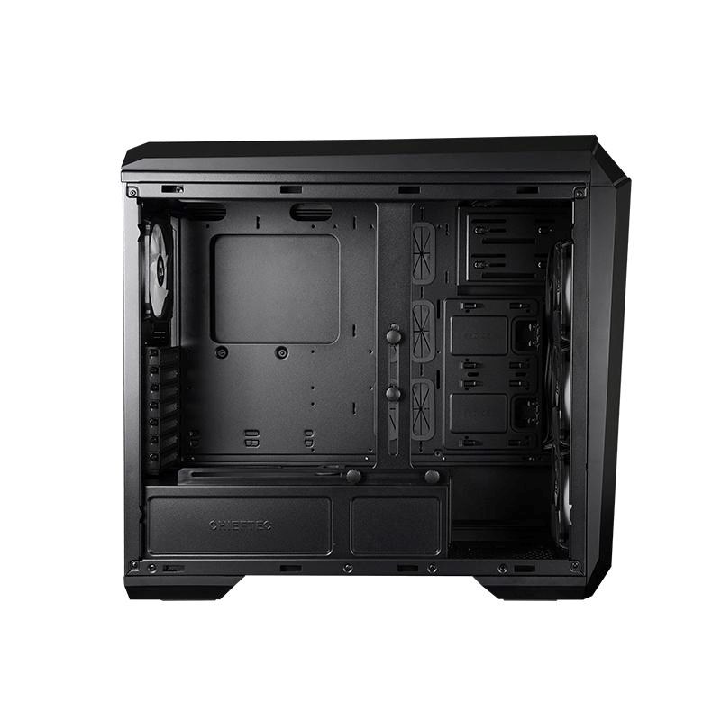 4 předinstalované 120mm ventilátory RGB RAINBOW RING jsou ovládány jednotkou dálkového ovládání, která je součástí rozsáhlého „rozsahu dodávky“. Propracovaný design interiéru umožňuje integraci přídavného 360mm chladiče vodního chlazení do přední části, a tak tato druhá generace herní skříně Chieftec splňuje a překonává očekávání každého hráče.