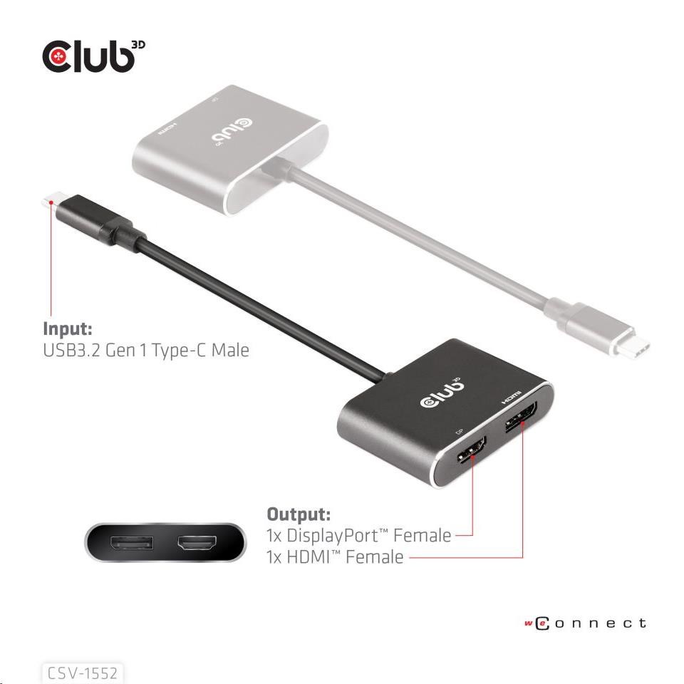 Club3D hub MST (Multi Stream Transport) USB3.2 Gen2 Type-C(DP Alt-Mode) na DisplayPort + HDMI 4K60Hz (M/F)