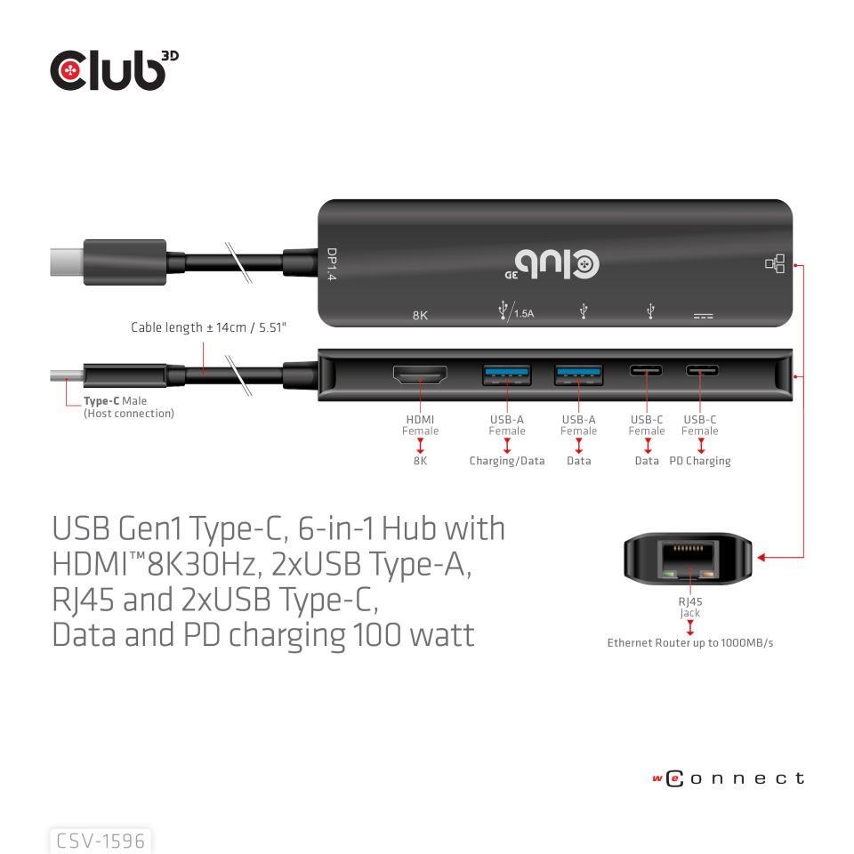 Club 3D CSV-1596 je USB Gen1 Type-C, rozbočovač 6 v 1 s HDMI™8K30Hz, 2xUSB Type-A, RJ45 a 2xUSB Type-C, dátové a PD nabíjanie 100 W, ktorý poskytuje ideálne riešenie na rozšírenie portu hostiteľa Type-C/Thunderbolt (PC/Laptop/Mobilný telefón atď.), najmä pre hostiteľov s jedným portom typu C. Tento rozbočovač využíva najnovšiu technológiu DP1.iC podporuje režim 4 Alt, ktorý umožňuje výstup videa HDMI™ s max. 8K30Hz a medzitým prenášať USB 3.1 dáta s maximálnou rýchlosťou 5 Gb/s. Dátové porty USB typu A a typu C umožňujú súčasné pripojenie 4 zariadení USB. 1 Gigabit Ethernet pre super rýchly Ethernet. Okrem toho samica typu C podporuje PD 3.0 PD Nabíjanie 100 W (15 W je vyhradených na fungovanie tohto produktu, zvyšok energie (max. 85 W) sa odovzdá na nabíjanie pre hostiteľa. Tento rozbočovač 6 v 1 bude fungovať na všetkých hostiteľských zariadeniach typu C s podporou režimu DP Alt.