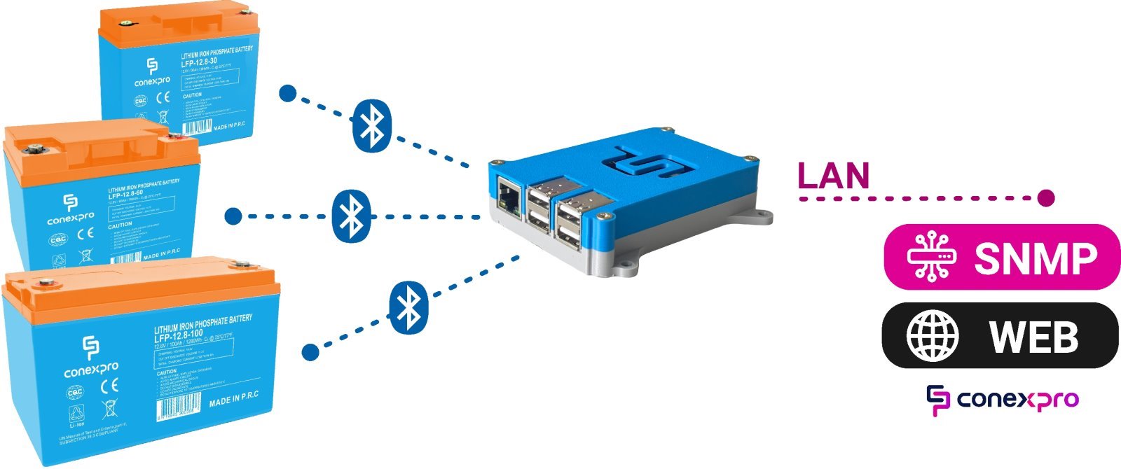 Conexpro BatMon-BT1 je kompaktní a dostatečně výkonné zařízení určené pro spolehlivý monitoring až 12 LiFePO4 baterií od značky Conexpro. Umožňuje přesné sledování napětí jednotlivých článků, celkového proudu, teploty i kapacity pomocí intuitivního Webového rozhraní nebo SNMP protokolu, a to pomocí Bluetooth komunikaci s bateriemi.