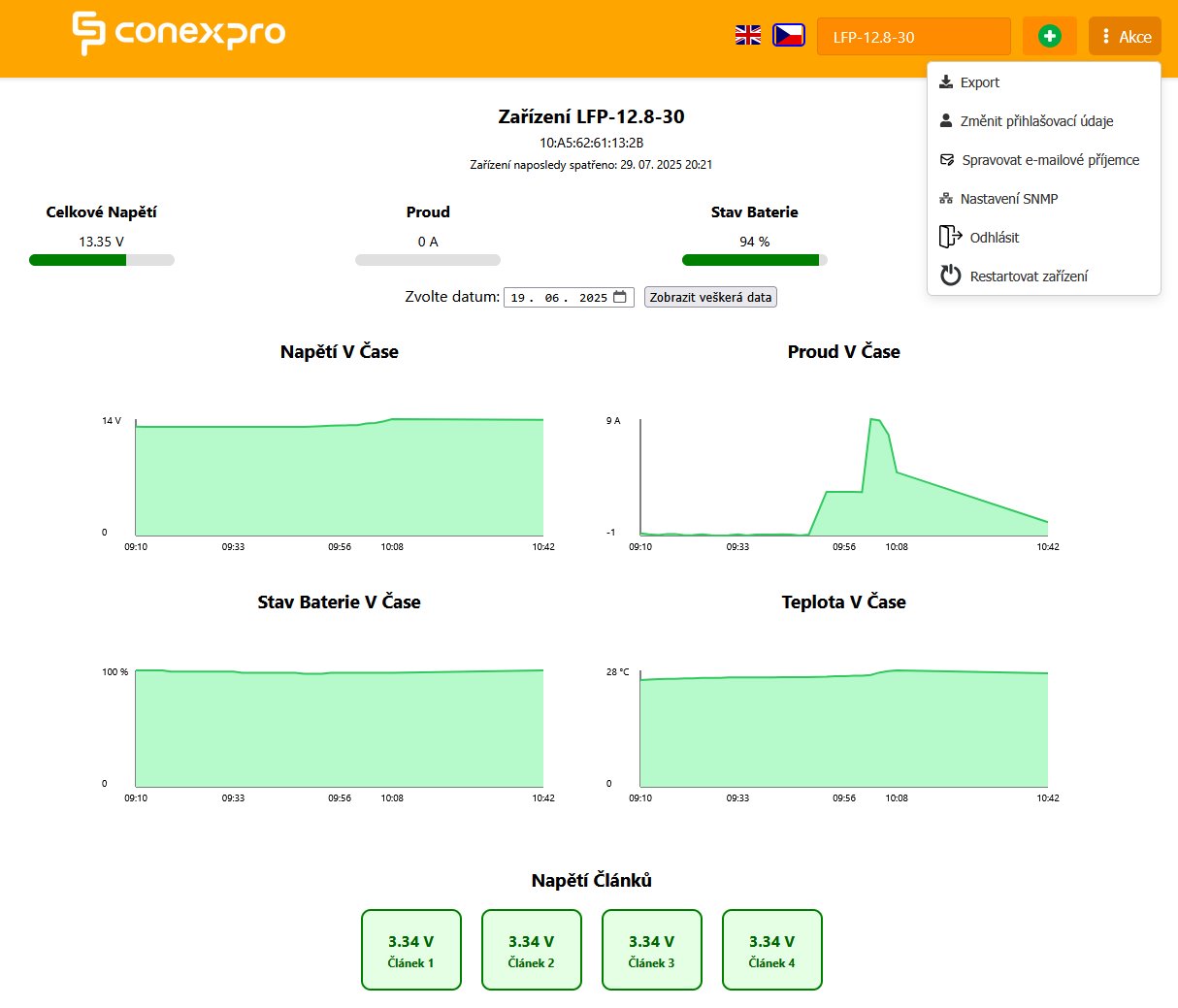 - Přehled a historie o celkovém napětí, napětí jednotlivých článků, proudu, kapacitě, teplotě všech baterií pomocí intuitivního webového rozhraní