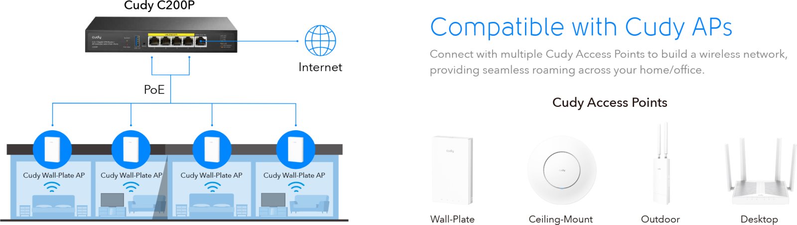 Gigabitový router s vestavěným AP Controllerem umožňuje snadnou správu rozsáhlé mesh sítě tvořené Access Pointy značky Cudy. Zařízení slouží zároveň jako PoE switch se 4mi porty s celkovým PoE budgetem 55 W a