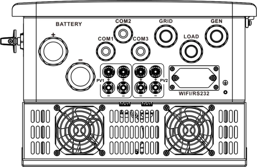 - Rozhraní ke komunikaci: CAN/RS-485 (pro BMS), Modbus (RTU 485 například pro Loxone, nebo externí řídící systém), RS-232 (pro cloud dongle)