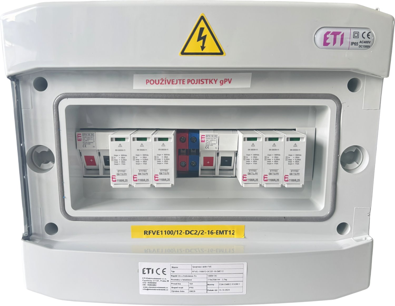 Kompletní nástěnná rozvodnice třídy 1+2, maximální napětí 1000 V určená pro povrchovou montáž a instalaci 2 stringů včetně certifikovace pro využití v rámci fotovoltaického systému. Je vybavena 2 svodiči přepětí T1+T2, 2 pojistkovými odpojovači a celkově 4 pojistkami (10 x 38 gPV 16A/1000V). Stupeň ochrany IP65 znamená, že rozvodnice při správné montáži zcela odolá prachu a tryskající vodě ze všech úhlů.