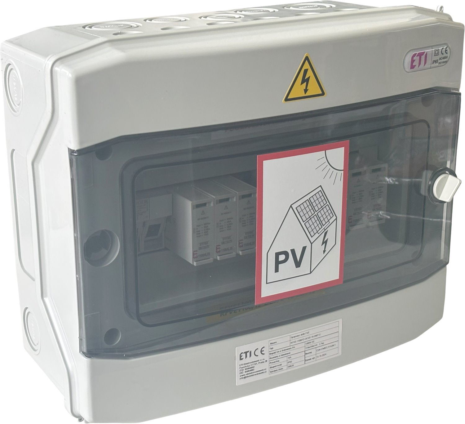 Kompletní nástěnná rozvodnice třídy 1+2, maximální napětí 1000 V určená pro povrchovou montáž a instalaci 2 stringů včetně certifikovace pro využití v rámci fotovoltaického systému. Je vybavena 2 svodiči