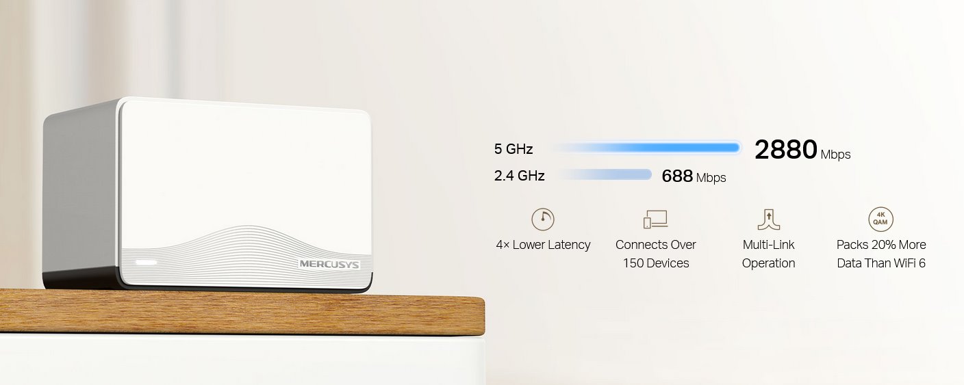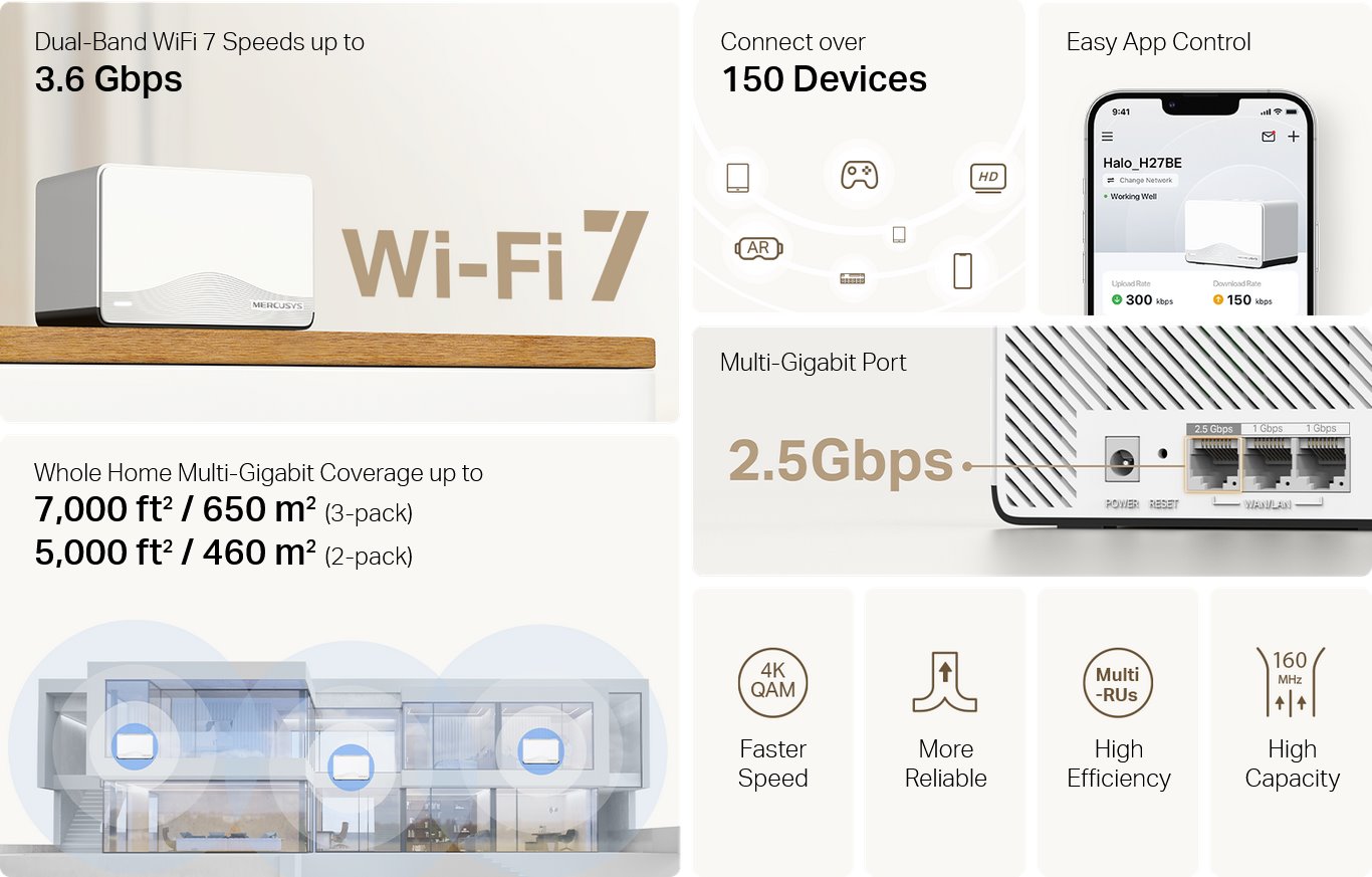 Každá jednotka má Wi-Fi 7 s modulačními rychlostmi 688 + 2880 Mbps (2.4 + 5 GHz) MU-MIMO s integrovanými anténami, třemi ethernetovými porty 1x 2.5 Gbps + 2x 1 Gbps (LAN/WAN). Jednotky podporují MLO, šířku pásma 160 MHz, OFDMA, Beamforming, seamless roaming a pokrytí plochy až 650 m2 díky třem jednotkám v balení. Pokud potřebujete rozšířit pokrytí, stačí jednoduše dokoupit další jednotky. Jednotky Halo podporují IPv6. Vhodným doplňkem do moderní domácnosti je také oddělená síť pro hosty nebo rodičovská kontrola.
