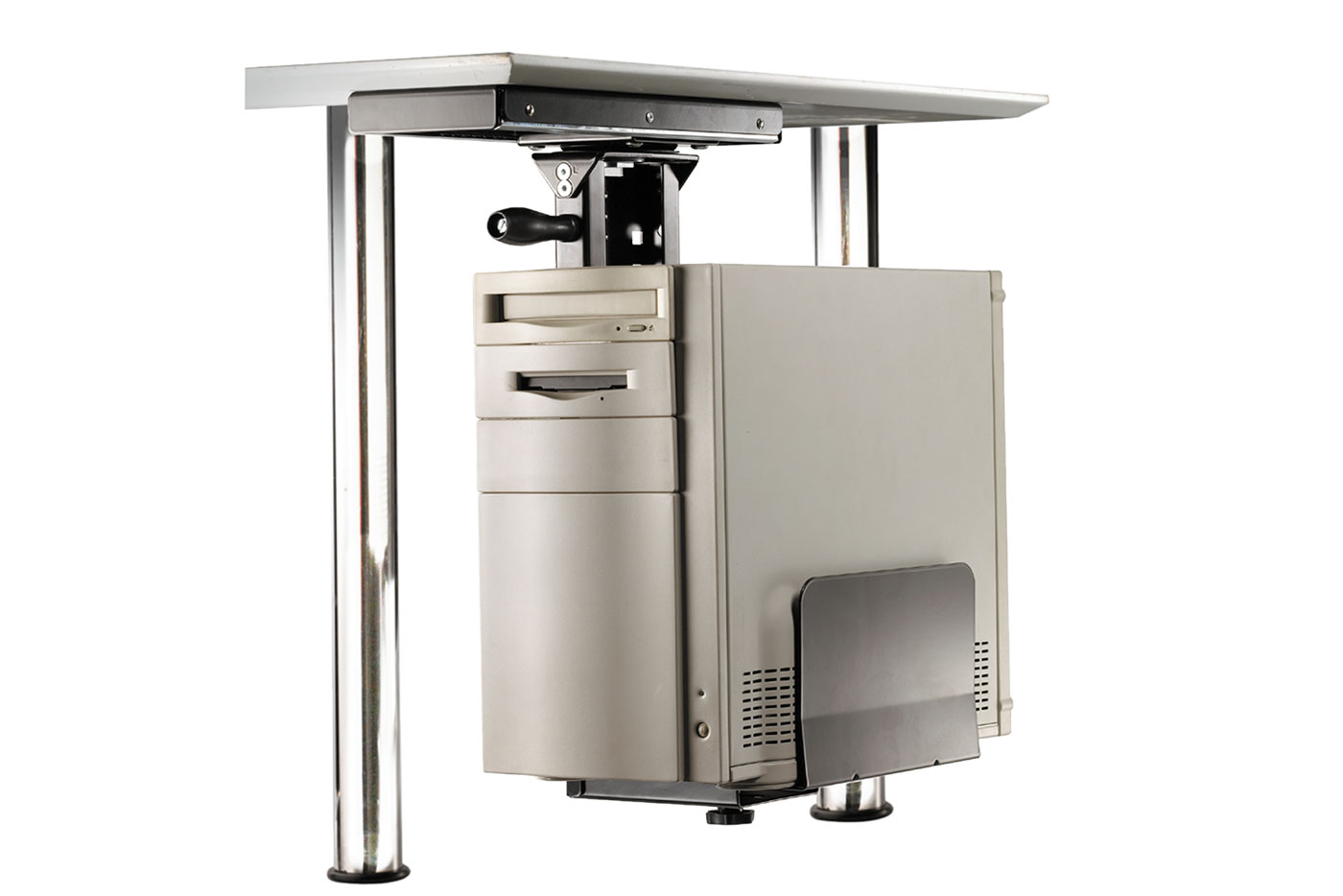 Držák na počítač montovaný pod desku stolu.