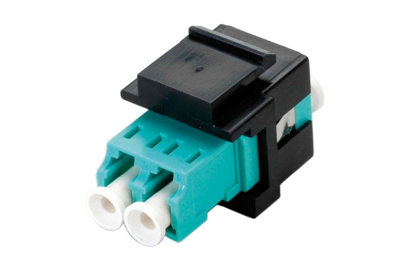 Spojka / průchodka pro optické kabely do třídy OM3 s konektory LC. Pro dvě vlákna (duplex). Keystone.- průchodka do patchpanelů nebo zásuvek určených pro keystone moduly