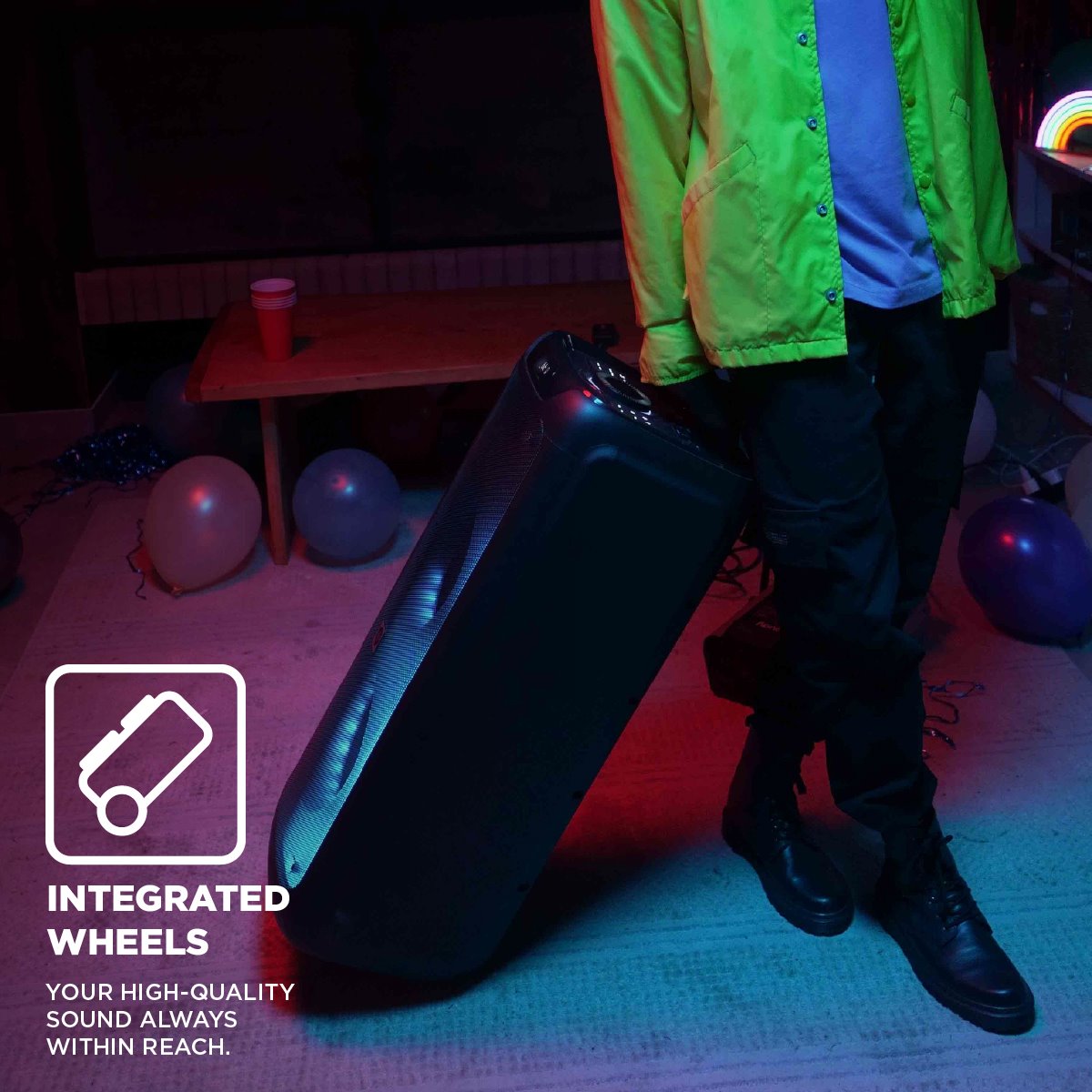 Stylový a výkonný Bluetooth reproduktor značky Stromberg s výkonem 80 W rozzáří každou párty díky integrovaným RGB LED světlům a dodávanému mikrofonu. Umožňuje připojení dalšího zařízení přes Stromberg