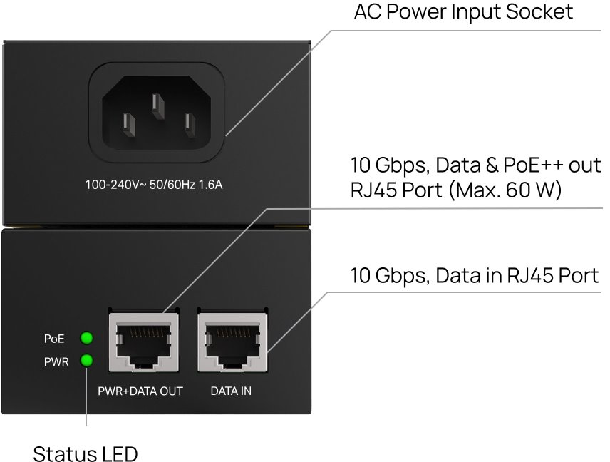 Výkonný PoE++ injektor podporujícími rychlosti až 10Gb/s zajišťuje rychlý a spolehlivý přenos dat. Vyhovuje standardům IEEE802.3af/at/bt a poskytuje až 60 W výkonu, přičemž současně přenáší data i napájení po jednom Ethernetovém kabelu, čímž snižuje náklady na infrastrukturu. Automaticky dodává potřebné množství energie podle připojeného zařízení. Odolné kovové pouzdro a možnost montáže na zeď nebo umístění na stůl zajišťují flexibilitu instalace.
