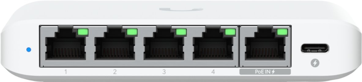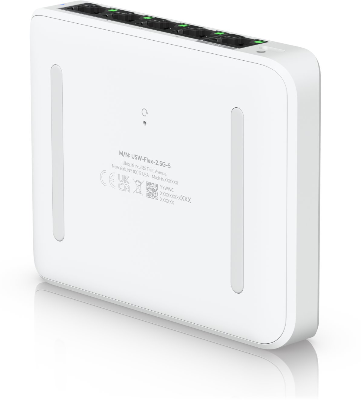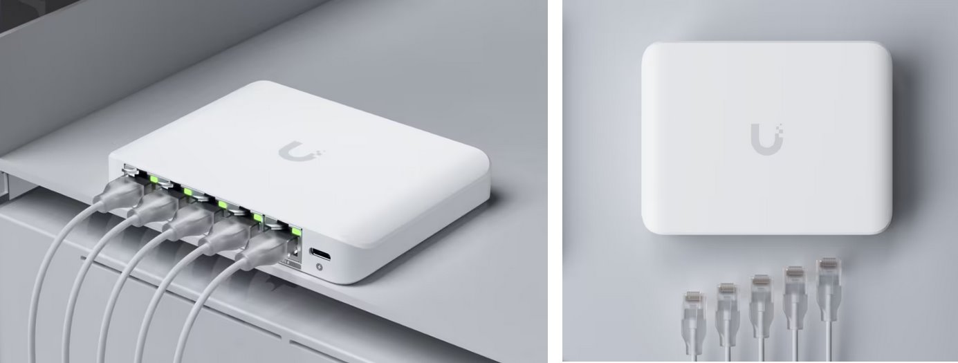 Managovatelný Flex Mini 2.5G switch s pěti 2.5 Gbps porty je navržený pro efektivní správu v síťové platformě UniFi Network. Napájení lze zajistit přes PoE nebo USB-C adaptér (součástí balení), což usnadňuje