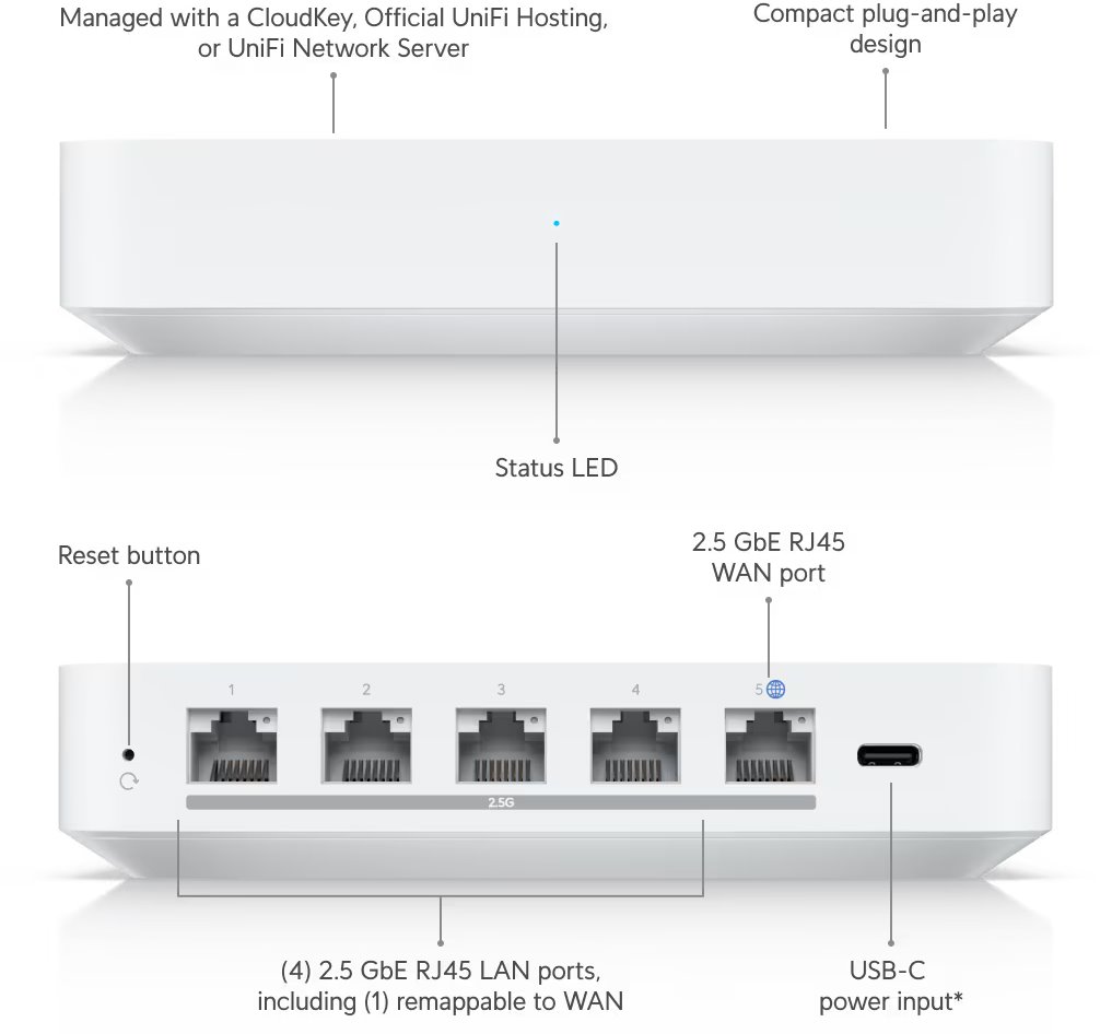 Velice výkonná a kompaktní brána UniFi Gateway Max od Ubiquiti Networks sjednocuje bezpečnostní bránu, směrovač dat a zabezpečení sítě. Produkt je vhodný do domácností či malých firem. V porovnání s předchozí generací (USG) UXG-Max disponuje 4x 2.5 Gigabitovými LAN porty a jedním 2.5 Gigabit WAN portem, 1,5 Gbps routovacím výkonem při zapnutí IDS/IPS, QoS, firewallu a systému detekce narušení (IDS) a prevence narušení (IPS). Zařízení lze spravovat pomocí aplikace UniFi Network, které je nainstalováno například na Cloud Key Gen2 Plus.