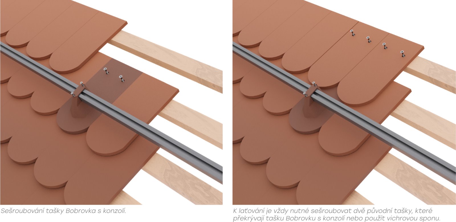 Akusolar střešní tašky typu bobrovka s integrovanou konzolou představuje špičkové řešení pro jednoduchou a šetrnou instalaci fotovoltaiky. Díky možnosti výměny tašek kus za kus není nutné vybrušování původních střešních krytin, což zachovává estetický vzhled střechy. Konzola umožňuje snadné uchycení konstrukce kompatibilní s profily 40 × 40 mm a 40 × 45 mm. Střešní tašky v cihlové barvě (RAL 8023) ladí s tradičním vzhledem bobrovek, a proto jsou ideální volbou pro elegantní i funkční integraci FVE systémů na šikmé střechy.