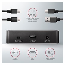 SuperSpeed USB-C 10 Gbps dokovací stanice AXAGON ADSA-M2C DUAL NVMe CLONE MASTER DOCK připojí k počítači snadno a rychle až dva NVMe (PCI-Express) M.2 SSD disky. Pohodlné připojení umožňuje oboustranný USB-C konektor. V balení naleznete rovnou dva kabely pro připojení dokovací stanice - klasický kabel USB-C -> USB-A a také USB-C -> USB-C kabel. Tento malý pomocník vám umožní nejjednodušší a nejrychlejší způsob připojení až dvou libovolných NVMe M.2 SSD disků k počítači. M.2 kartu jen vezmete a zasunete do základny, nejsou potřeba žádné nástroje ani doplňky. Výměna M.2 SSD disků je tak velmi rychlá a lehká. Dokovací stanici také využijete pro snadné klonování obsahu připojených NVMe disků bez potřeby připojení k PC. Do prvního slotu stanice (source) zasunete zdrojový M.2 disk a do druhého slotu (target) zasunete cílový M.2 disk. Pak jen zmáčknete klonovací tlačítko a sledujete průběh klonování na stupnici ze čtyř LED diod. Po zkopírování všech dat je na cílovém disku přesná kopie původního M.2 disku. Dock tak lze využít jako autonomní zařízení pro pohodlné duplikování a vytváření obrazů disků. Jedná se o nejjednodušší způsob, jak přenést obsah jednoho SSD disku na další SSD disk, a to včetně funkčního operačního systému (Windows, macOS, Linux …). Rychlé rozhraní USB 3.2 Gen 2 a podpora NVMe Express s podporou UASP dovolí užívat si rychlost moderních NVMe M.2 SSD disků. Stanice podporuje funkci TRIM pro omezení pozvolné degradace výkonu SSD v čase a umožňuje čtení S.M.A.R.T. informací monitorujících kondici připojených disků. Robustní tělo stanice je vyrobeno z hliníku v moderním designu. Nízko položené těžiště dokovací stanice zajišťuje dobrou stabilitu. Gumové nožky omezují posouvání po stole. Vstup: • USB 3.2 Gen 2 (USB 3.1 Gen 2) SuperSpeed USB 10 Gbps s rychlostí až 10 Gbit/s. • Připojení přes USB type C female konektor. Podpora zařízení: • NVMe (PCI-Express) M.2 SSD jedno i oboustranné disky, • bez omezení kapacity disku, • podpora M.2 disků o rozměrech 2230, 2242, 2260, 2280, 22110 mm, • podpora M-KEY & B+M-KEY NVMe M.2 SSD disků, • NGFF 75-pinový M-key slot pro NVMe M.2 disky. Funkce klonování obsahu disku: • Klonování probíhá bez připojení stanice k počítači. • Cílový disk musí mít stejnou nebo větší kapacitu než disk zdrojový, jinak nelze klonování spustit. • Rychlost klonování SSD až 1000 MB/s. • Celkový čas naklonování disku závisí na kapacitě zdrojového disku, ne na objemu dat na disku. Další vlastnosti: • Kompatibilní s USB 3.2 Gen 2, zpětně kompatibilní s USB 3.2 Gen 1 (USB 3.0) a USB 2.0. • Podpora přenosových rychlostí 10.000 / 5000 / 480 Mbit/s (SuperSpeed+ / SuperSpeed / HighSpeed). • Vyhovuje PCI Express Base Specification Revision 3.1a specifikaci. • Vyhovuje NVM Express 1.3c specifikaci. • Vyhovuje USB Mass Storage Class specifikaci. • Celková propustnost / přenosová rychlost stanice je dána použitým USB 3.2 Gen 2 rozhraním (teoreticky až 10 Gbit/s). • Reálná propustnost / přenosová rychlost stanice kolem 1000 MB/s (1 GB/s) je dána limity USB 3.2 Gen 2 rozhraní. • Podpora UASP (USB Attached SCSI) pro rychlejší přenos dat ve Windows 8 a novějších. • Podpora funkce TRIM pro omezení pozvolné degradace výkonu SSD v čase. • Podpora bootování z SSD. • Plná podpora Plug and Play. • Připojení přes USB 3.2 Gen 2 type C female konektor. • Kabel USB type C male / USB type C male délky 25 cm je součástí balení. • Kabel USB type C male / USB type A male délky 25 cm je součástí balení. • Hliníkové tělo s integrovaným závažím pro lepší stabilitu a gumové nožky zamezují posouvání na stole. • Rozměry stanice 68 x 68 x 17 mm. • Hmotnost 94 g. Napájení: • Napájení pomocí přiloženého externího AC/DC adaptéru 5V - 3A s kabelem délky 150 cm. • Vypínač napájení. LED indikace: • 2x bílá LED dioda u každého disku indikuje připojení disku (trvalým svitem) a přenos dat (blikáním). • 4x modrá LED dioda indikující průběh klonování 25%-50%-75%-100% (blikáním), resp. dokončení klonování (trvalým svitem). Podporované operační systémy: • MS Windows 7 / 8.1 / 10 /11 a novější, Windows Server 2008 / 2012 / 2016 / 2019 a novější (podporovány všechny 32- i 64-bitové verze OS Windows), Mac OS X 10.x a vyšší, Linux s jádrem 2.6.x a vyšším. Pozn.: Ovladače jsou obvykle součástí podporovaných operačních systémů. Při použití s Windows 7 je nutné ověřit u výrobce M.2 SSD disku podporu tohoto OS a dostupnost ovladače. Balení v kartónové krabičce obsahuje: • NVMe dock, • napájecí adaptér 100-240V / 5V/3A, • USB-C <-> USB-A kabel 25 cm, • USB-C <-> USB-C kabel 25 cm, • multijazyčný manuál CZ/DE/DK/ENG/ESP/FIN/FR/GR/HR/HU/IT/NL/PL/PT/RO/RU/SK/SWE/BG/CN/TR/ARA.