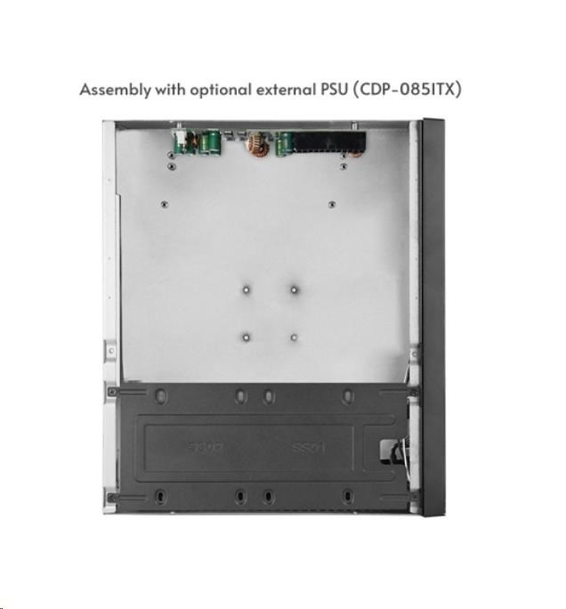 Výkon zdroje (ve W):0; Provedení skříně:Mini ITX; Barva skříně:Černá; Počet pozic 2.5" (SSD):2; Vybavení PC skříně:Be...