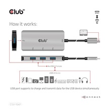 Club 3D CSV-1547 je rozbočovač USB Gen2 typu C na štyri porty USB typu A, ktorý pridáva štyri bežné porty USB typu A k vášmu zariadeniu s rozhraním USB typu C 10G na prenos dát a nabíjanie. Môže fungovať na akomkoľvek hostiteľovi typu C (PC, notebook, tablet, mobilný telefón atď.). Funguje so všetkými hlavnými operačnými systémami.