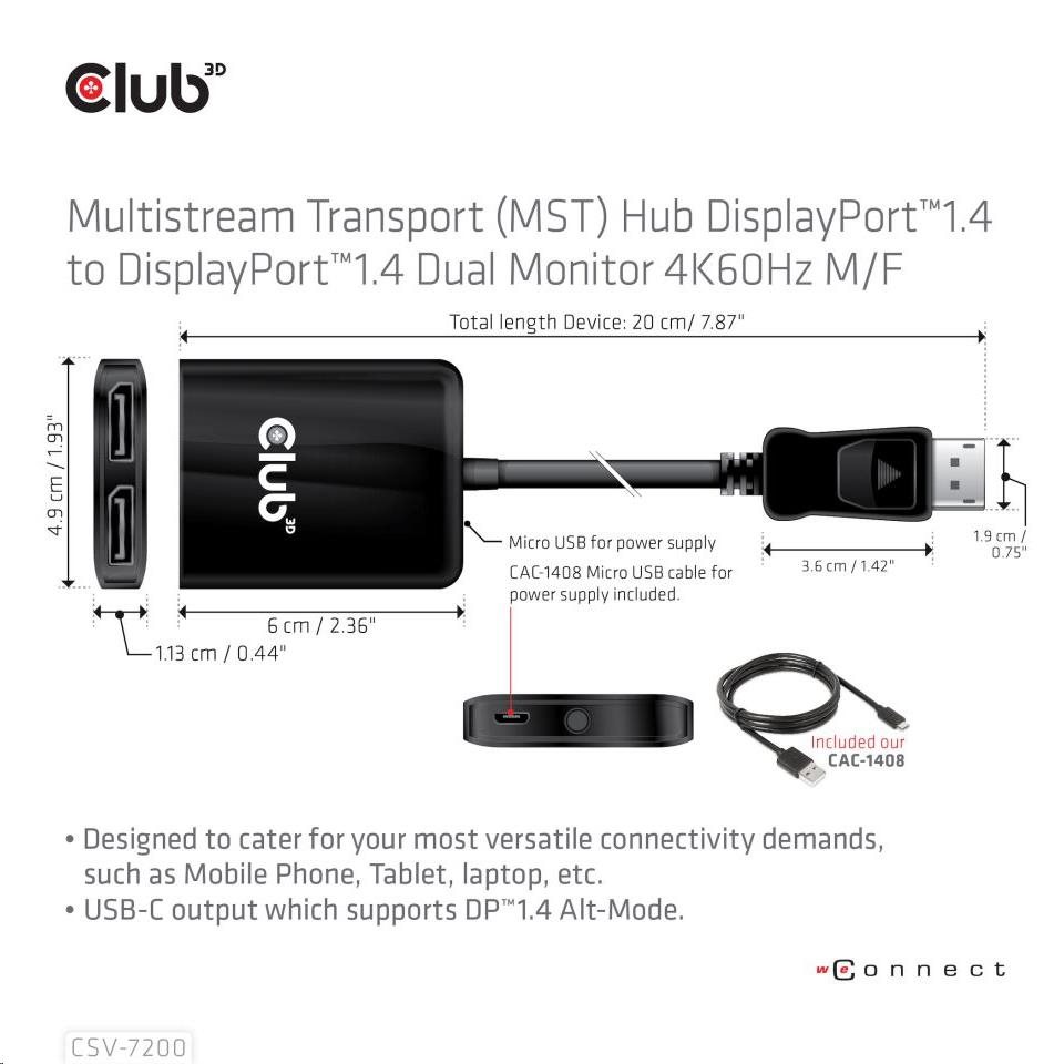 Club3D Video adaptér MST (Multi Stream Transport) DisplayPort 1.4 na DisplayPort 1.4 Dual Monitor 4K60Hz (M/F), černá