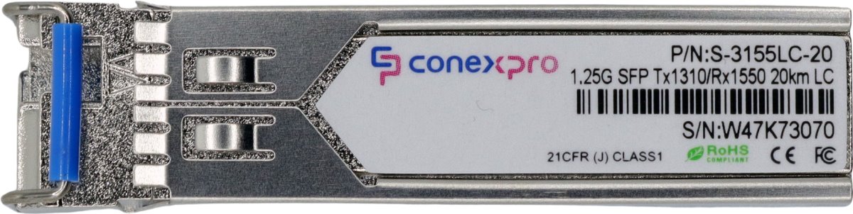 Gigabitový WDM/Bidi Singlemode SFP modul od výrobce Conexpro s vlnovou délkou (Tx/Rx) 1310/1550 nm, rychlostí 1 Gbps, vybavený jedním LC konektorem s UPC broušením a je určený pro spojení na vzdálenost až 20 km. Tento modul poskytuje univerzální kompatibilitu, což znamená, že je schopen spolupracovat s téměř všemi dostupnými aktivními prvky. Samozřejmostí je podpora diagnostiky optického spojení pomocí funkce DDM (Digital Diagnostic Monitoring).