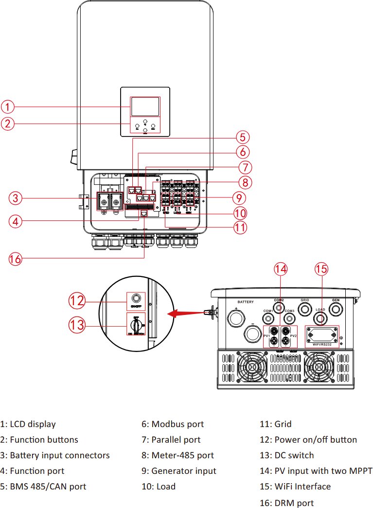 - Rozhraní ke komunikaci: CAN/RS-485 (pro BMS), Modbus (RTU 485 například pro Loxone, nebo externí řídící systém), RS-232 (pro cloud dongle)