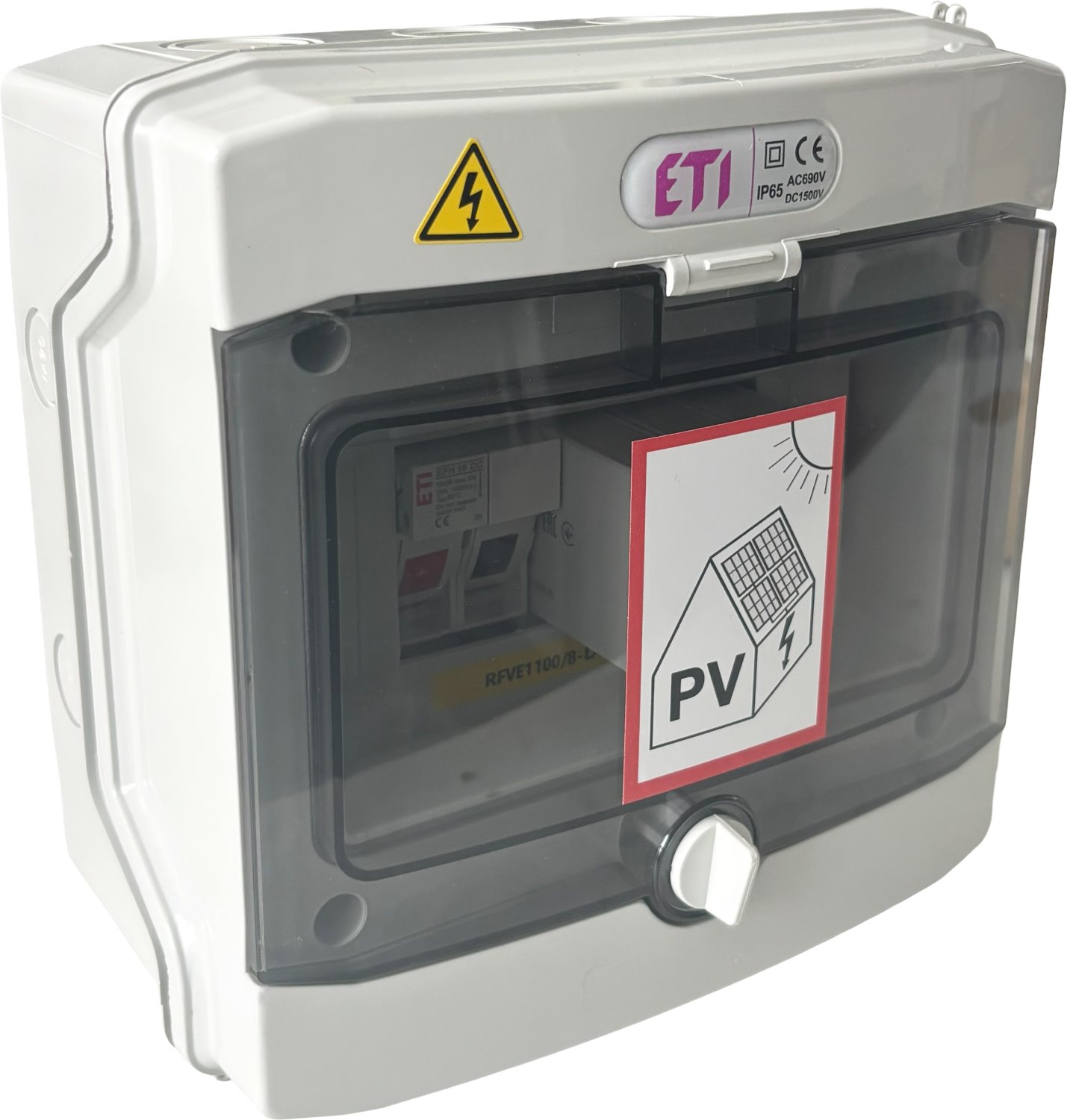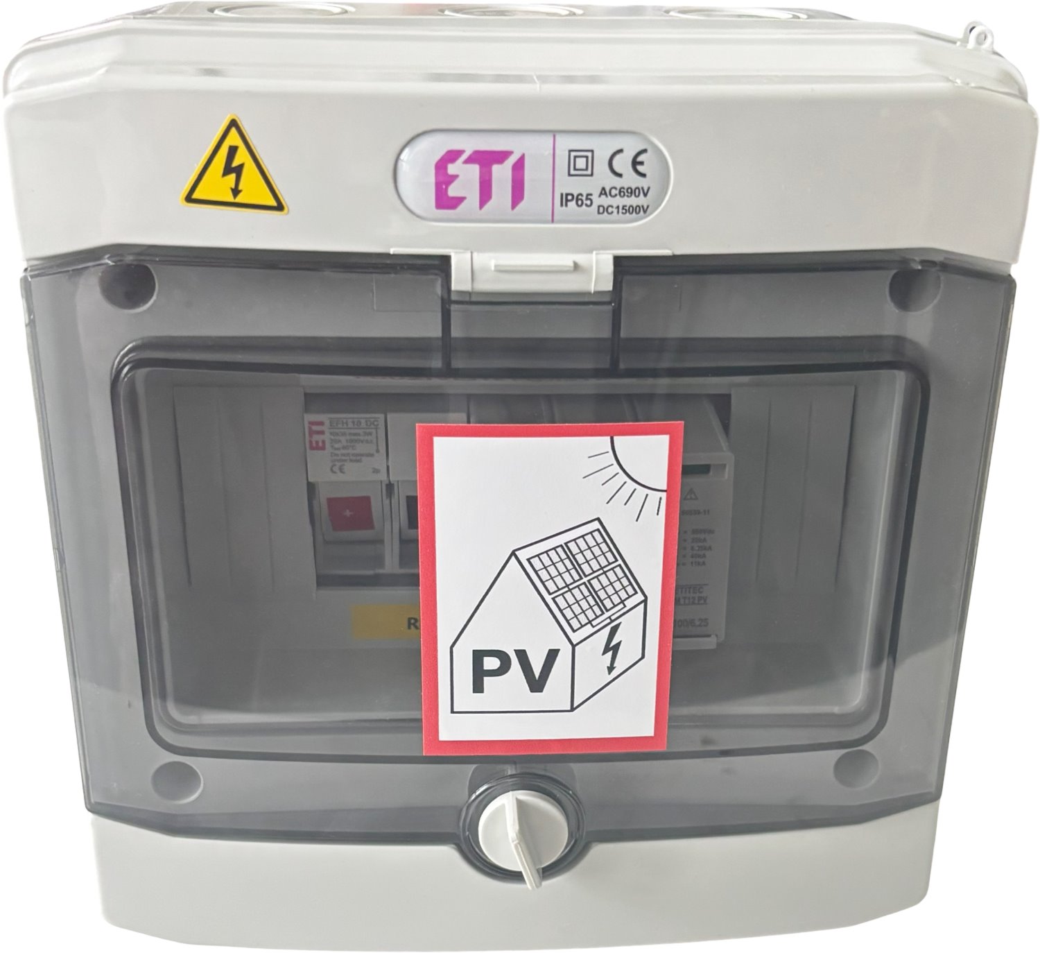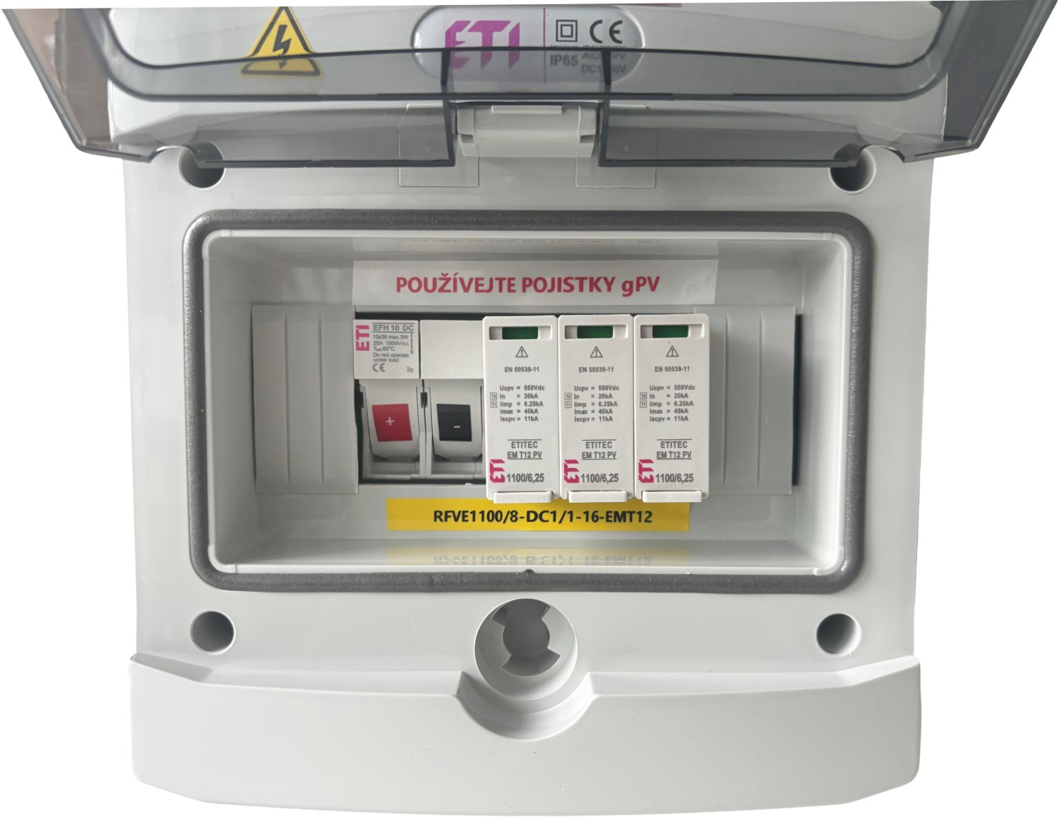Kompletní nástěnná rozvodnice určená pro povrchovou montáž a instalaci 1 stringu včetně certifikovace pro využití v rámci fotovoltaického systému. Je vybavena 1 svodičem přepětí T1+T2, 1 pojistkovým odpojovačem a 2 pojistkami (10 x 38 gPV 16A/1000V). Stupeň ochrany IP65 znamená, že rozvodnice při správné montáži zcela odolá prachu a tryskající vodě ze všech úhlů.