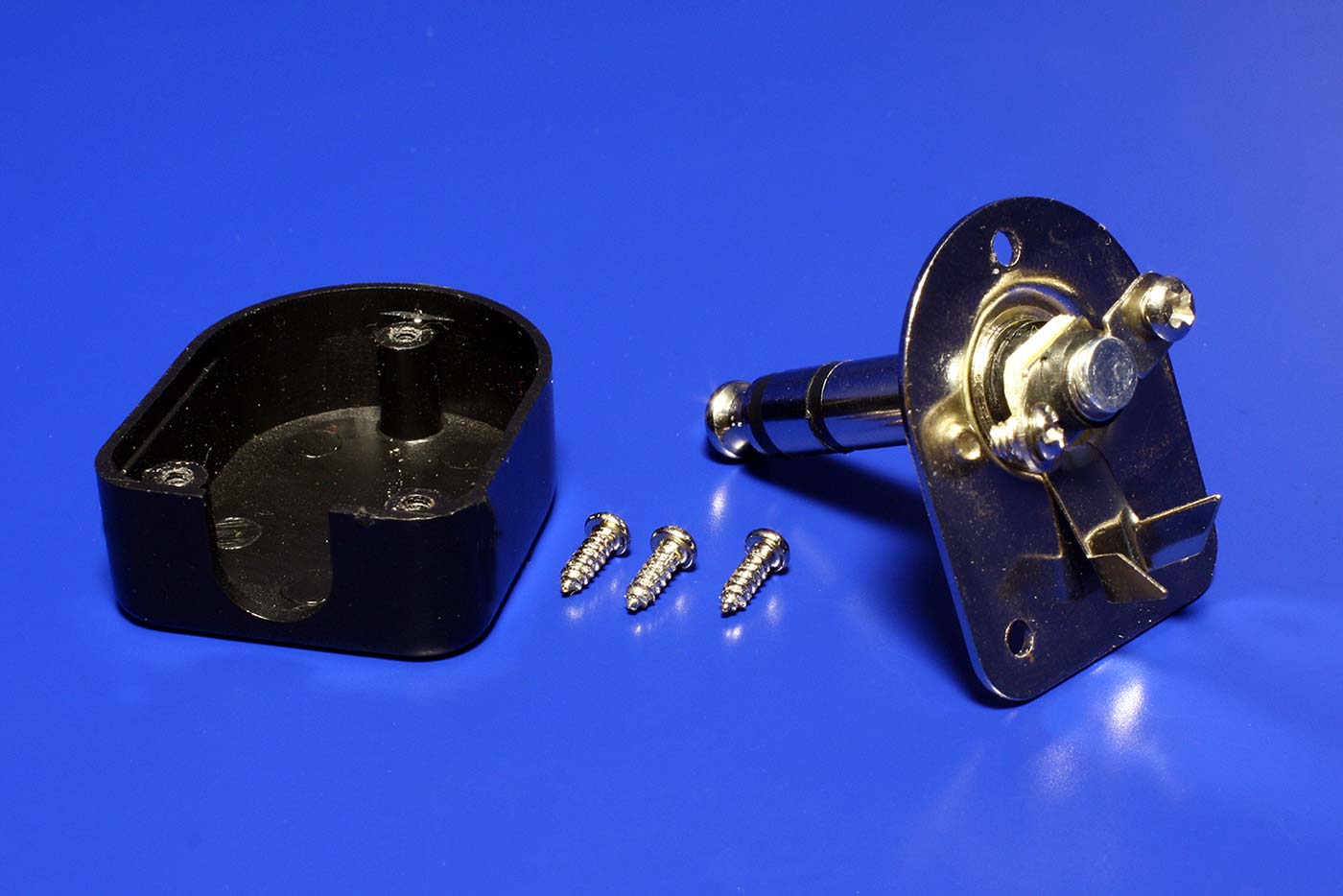Audio stereofonní konektor jack 6,35mm lomený o 90°, pro montáž na kabel.