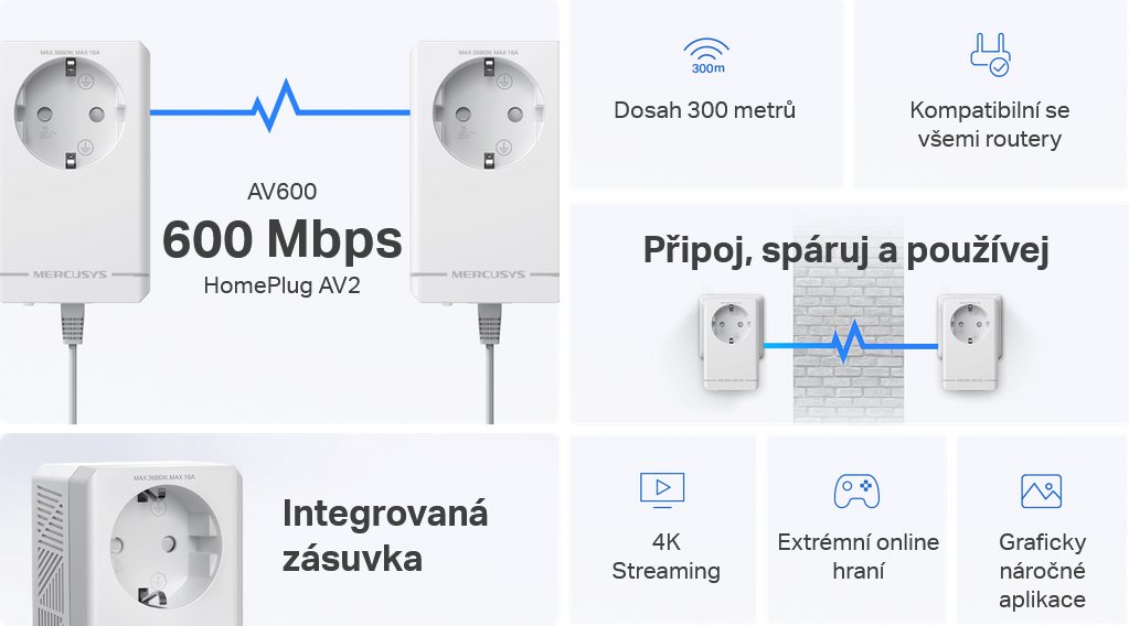 - Rychlost přenosu až 600 Mbps díky technologii HomePlug AV2