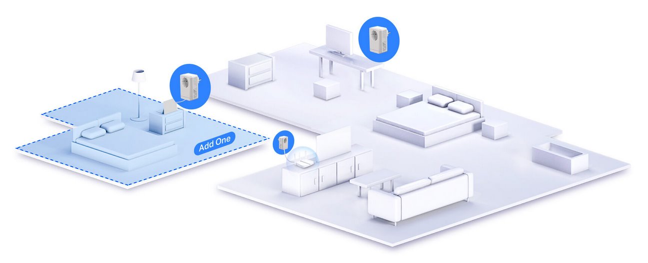 - Možnost snadného rozšíření sítě přidáním dalších Powerline adaptérů
