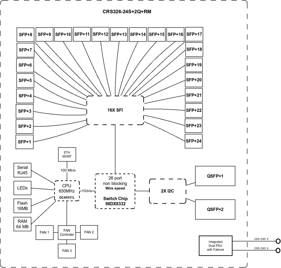 Switch má celkově 2x QSFP+ porty a 24x SFP+ portů, což poskytuje celkovou propustnost 320 Gbps a přepínací kapacitu 640 Gbps s rychlostí přeposílání 252 Mpps u většiny běžných paketů.