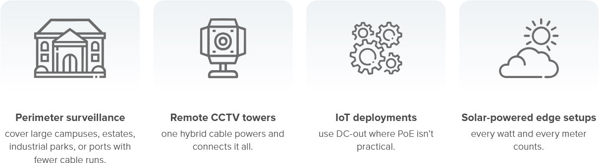 Venkovní průmyslový switch navržený pro náročné instalace, kde je potřeba efektivně přenášet data a napájení na dlouhé vzdálenosti. Díky kombinaci 3 Gigabit Ethernet portů s PoE funkcionalitou, 3 vysokorychlostními 10G SFP+ porty pro optické spoje a 3 DC výstupy pro napájení specializovaných přístrojů nabízí flexibilitu pro různé aplikace. Switch je ideální pro velké areály, bezpečnostní systémy nebo solární instalace na odlehlých místech. Hybridní kabel umožňuje kombinovaný přenos dat a napájení, což zjednodušuje instalace a zajišťuje spolehlivý provoz na dlouhých vzdálenostech.