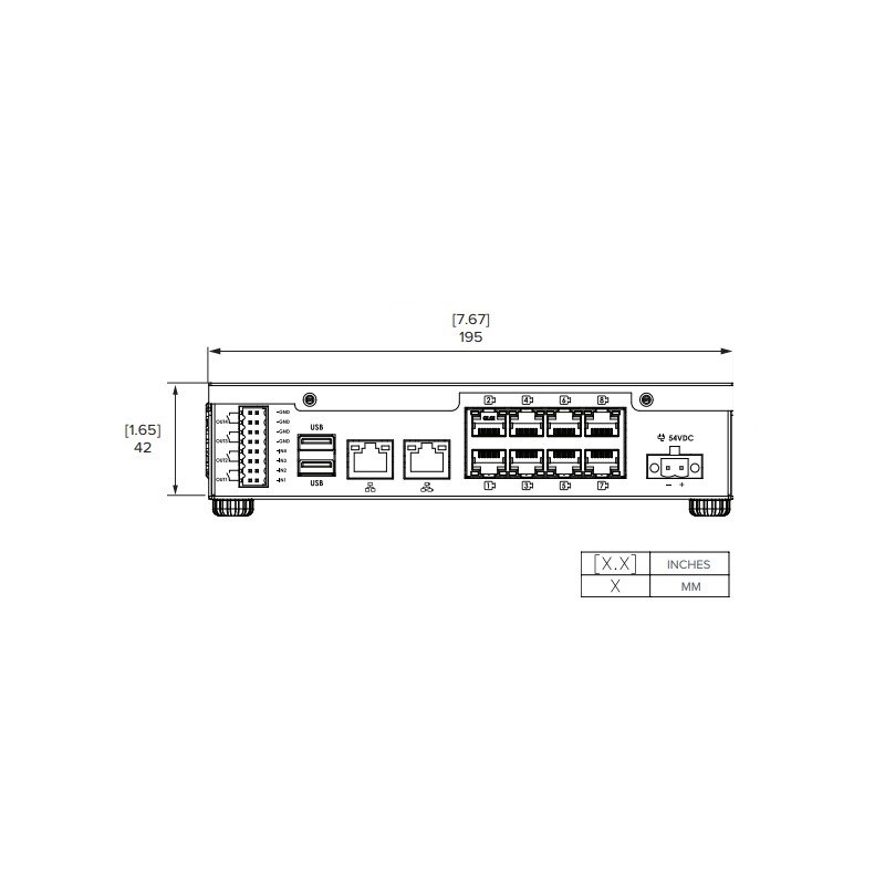 Počet kamer IP: do 8 kamer; Max. rozlišení záznamu: 30 Megapixel; Počet HDD slotů: 1x; Video výstup: Neobsahuje; Alarmy In / Out: 4 / 4; Audio In / Out: Neobsahuje; Datová propustnost (In / Out): 130 / 80 Mbps