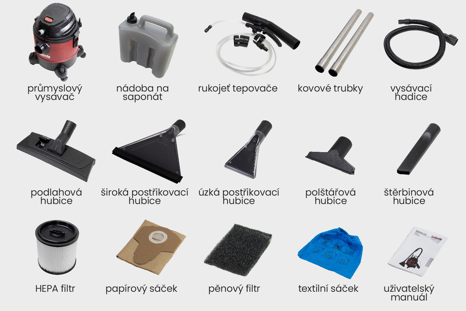 • Průmyslový vysavač • Nádoba na saponát • Rukojeť tepovače • Kovové trubky • Vysávací hadice • Podlahová hubice • Široká postřikovací hubice • Úzká postřikovací hubice • Polštářová hubice • Štěrbinová hubice • Hepa filtr • Papírový sáček • Pěnový filtr • Textilní sáček • Uživatelský manuálPŘÍPLATKOVÉ PŘÍSLUŠENSTVÍ: