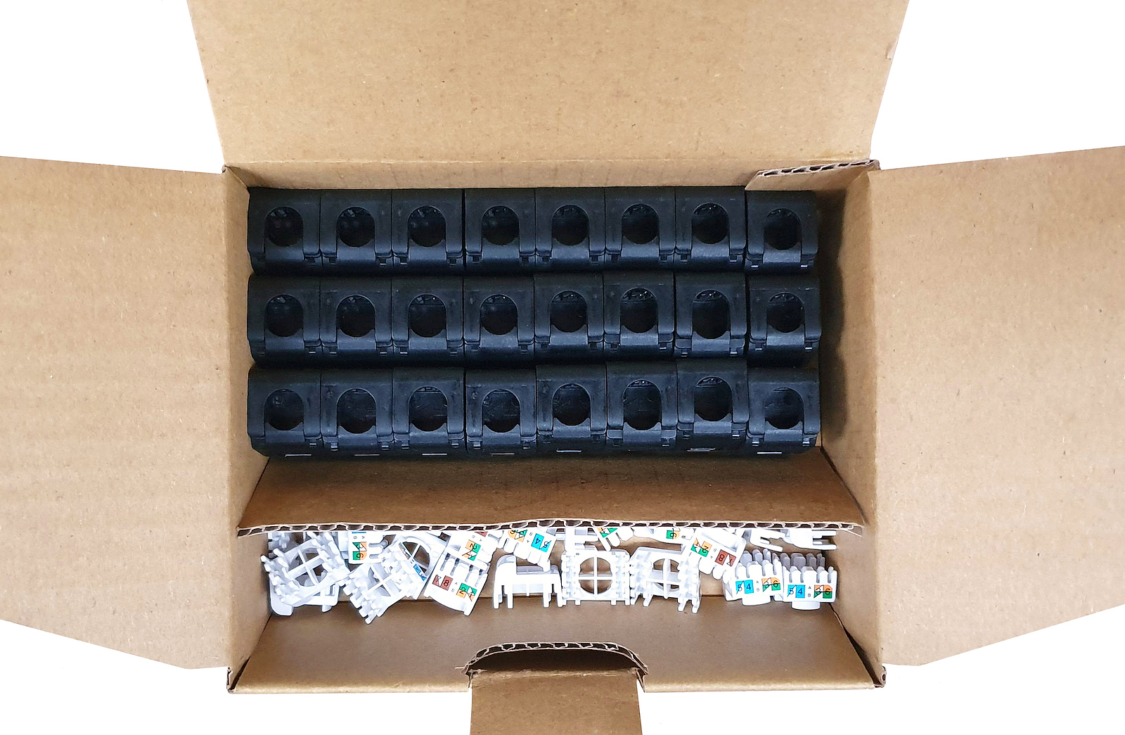 Balení 24 kusů, samořezný nestíněný keystone CAT5E RJ45, černý.