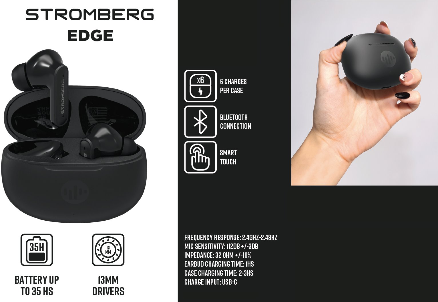 Bezdrátová sluchátka Stromberg EDGE zaujmou nejen moderním designem, ale i vylepšenou Bluetooth konektivitou pro stabilní a rychlý přenos zvuku bez zpoždění. Díky baterii s výdrží až 35 hodin si hudbu, hovory i videa užijete opravdu dlouho. Nabíjecí pouzdro zvládne až 6 nabití a 13mm měniče přinášejí bohatý a čistý zvuk. Dotykové ovládání umožňuje snadné přepínání skladeb nebo příjem hovorů, zatímco USB-C vstup zajišťuje rychlé dobití sluchátek i pouzdra.