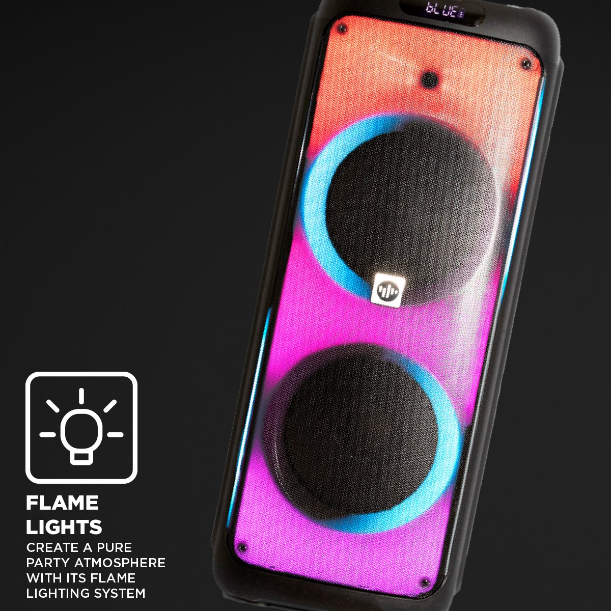 Stylový a výkonný Bluetooth reproduktor značky Stromberg s výkonem 120 W rozzáří každou párty díky integrovaným RGB LED světlům a dodávanému mikrofonu. Umožňuje připojení dalšího zařízení přes Stromberg