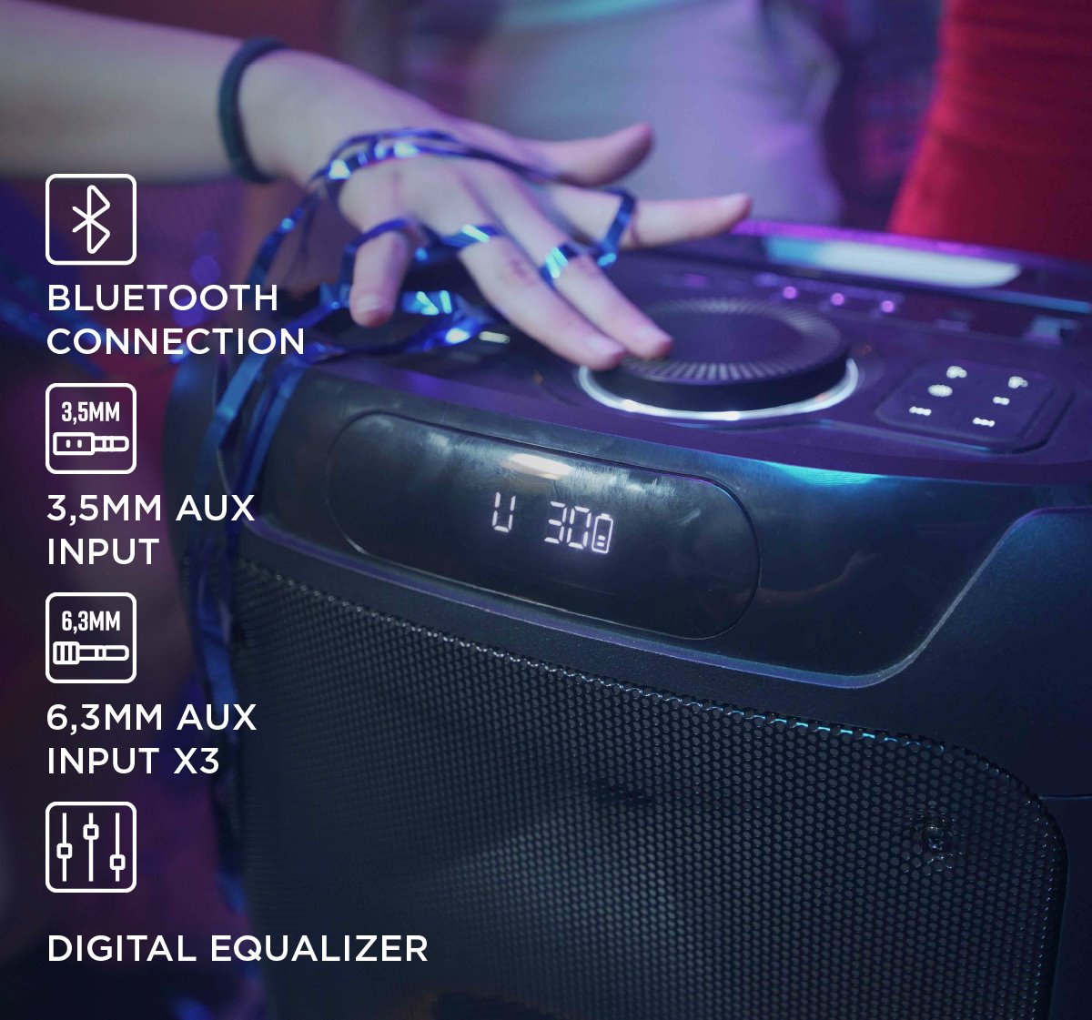 Stylový a výkonný Bluetooth reproduktor značky Stromberg s výkonem 120 W rozzáří každou párty díky integrovaným RGB LED světlům a dodávanému mikrofonu. Umožňuje připojení dalšího zařízení přes Stromberg Connect pro dosažení působivého stereo efektu. Nechybí nastavení basů a výšek, ani speciální hlasové efekty pro karaoke. Díky výdrži baterie až 6,2 hodiny si užijete zábavu bez přerušení, ať už doma nebo venku. Připojení zajišťuje Bluetooth i AUX vstup.