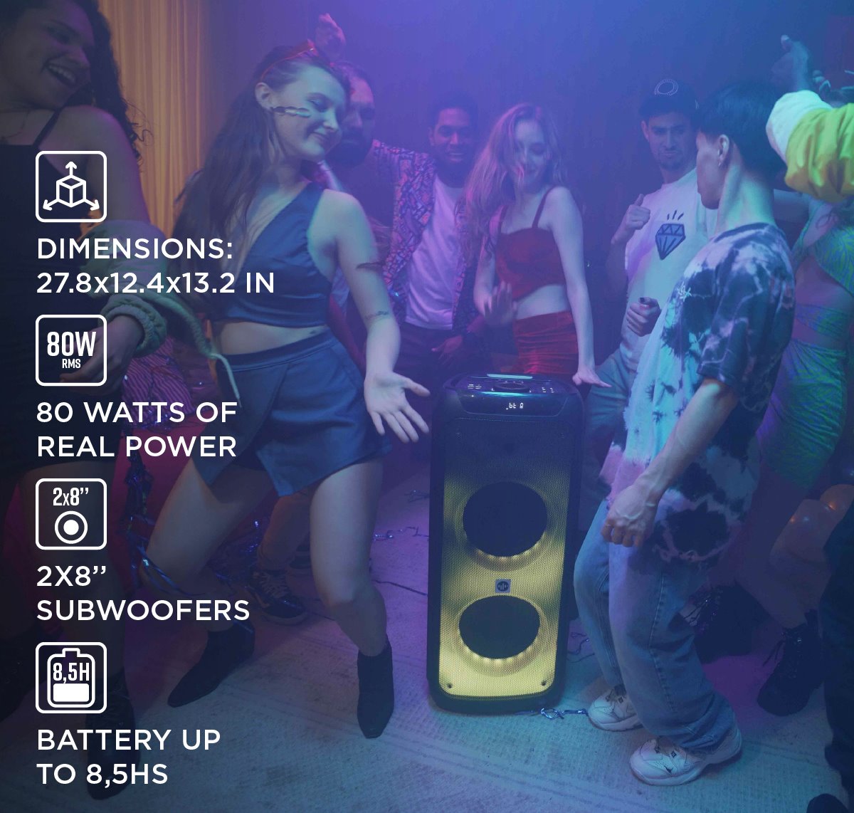 Stylový a výkonný Bluetooth reproduktor značky Stromberg s výkonem 80 W rozzáří každou párty díky integrovaným RGB LED světlům a dodávanému mikrofonu. Umožňuje připojení dalšího zařízení přes Stromberg Connect pro dosažení působivého stereo efektu. Nechybí nastavení basů a výšek, ani speciální hlasové efekty pro karaoke. Díky výdrži baterie až 8,5 hodiny si užijete zábavu bez přerušení, ať už doma nebo venku. Připojení zajišťuje Bluetooth i AUX vstup.