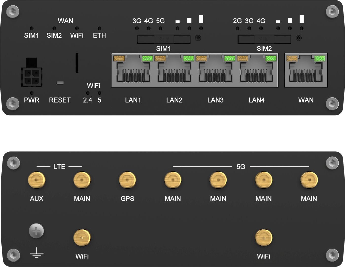 - (4 + 2) SMA female (5G + LTE) + (2) RSMA female (Wi-Fi) + (1) SMA female (GNSS)