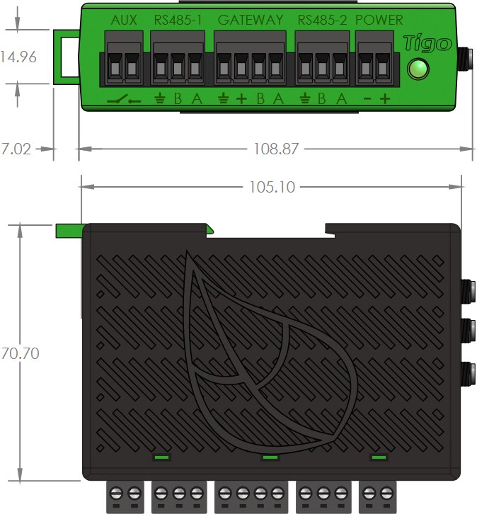Cloud connect advanced kit obsahuje Gateway, datalogger Cloud Connect Advanced a spojuje inteligentní panely s Cloud monitorovacím softwarem Tigo Smart . Gateway je nainstalovaná na střeše u panelů a přijímá