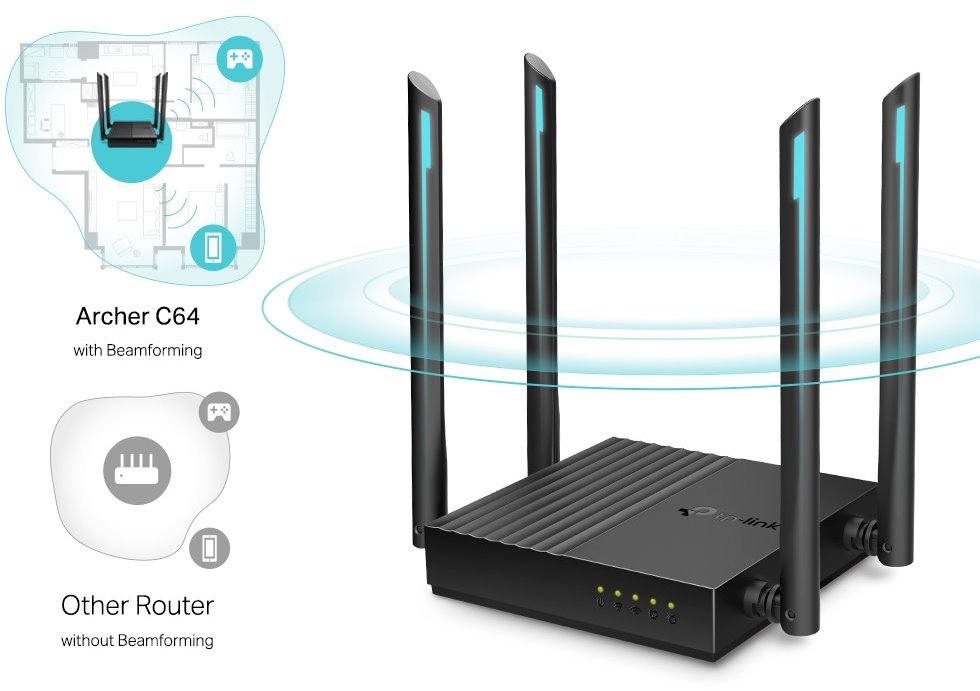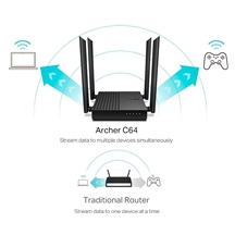 Archer C64 je velmi kompaktní Dual-Band router značky TP-Link, který obsahuje 4× 10/100/1000Mbps LAN , 1× 10/100/1000Mbps WAN a 4 fixní antény. Bezdrátová část umí pracovat ve dvou pásmech zároveň