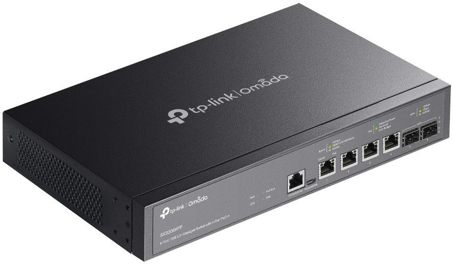 Omada SX3206HPP PoE Switch značky TP-Link je managovatelný L2 switch s funkcí PoE, obsahující 4x 10Gigabitové LAN porty s funkcí 802.3af/at/bt PoE se stropem 60 W / port a k tomu další 2x 10Gigabitové SFP+