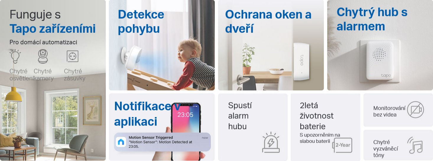 Výhodná startovací sada zahrnuje centrální jednotku, pohybový senzor a dva detektory otevření okna či dveří, které spolu komunikují bezdrátově na frekvenci 868 MHz. Díky vyměnitelným bateriím s výdrží až 2 roky je zajištěn dlouhodobý provoz. Nastavitelné akce, jako je rozsvícení nebo zapnutí zařízení, reagují na detekované události. Sada se snadno integruje do ekosystému Tapo, zahrnujícího chytré žárovky, LED pásky, kamery a další zařízení, což zajišťuje komplexní ovládání chytré domácnosti. Ideální řešení pro jednoduché zabezpečení a automatizaci.