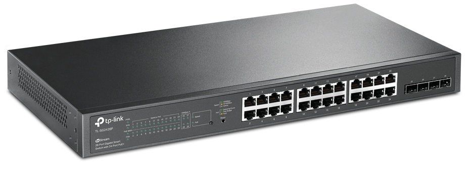 Jetstream TL-SG2428P PoE Switch značky TP-Link je managovatelný L2 switch s funkcí PoE, obsahující 24 Gigabitových LAN portů s funkcí 802.3af/at PoE a k tomu další 4 Gigabitové SFP porty. Switch má celkový PoE budget pro napájení zařízení po kabelu 250 W, switch lze montovat do 19" racku a o chlazení se starají 2 ventilátory z boku.