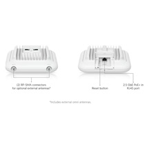 Bezdrátový UniFi U7 Pro Outdoor je Wi-Fi 7 Dual Band Access point s až 4x4 MIMO, modulačními rychlostmi 688 + 8640 Mbps (2.4 + 5 GHz) s podporou Wi-Fi standardů 802.11a/b/g/n/ac/ax/be. Vzhledem k minimálním rozměrům je možné jednotku diskrétně začlenit do jakéhokoliv prostředí. Díky fyzickému provedení je možné access point instalovat jak uvnitř budov tak ve venkovním prostředí (IPx6 krytí). Jednotku lze napájet pouze přes PoE (802.3at / 44 až 57V DC) po 2.5 Gigabitovému LAN portu ve spodní straně zařízení. O distribuci Wi-Fi signálu se stará dvojice vestavěných antén ale je také možné připojit externí anténu pomocí externích RSMA female konektorů na vrchu zařízení.