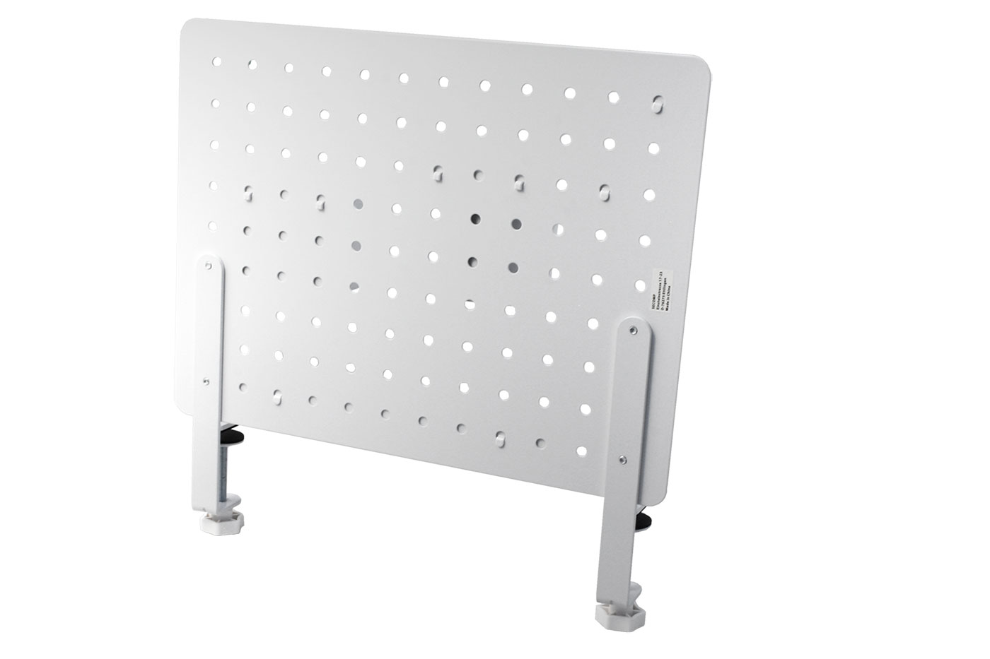Děrovaná deska se sadou držáků montovaná na kraj stolu.