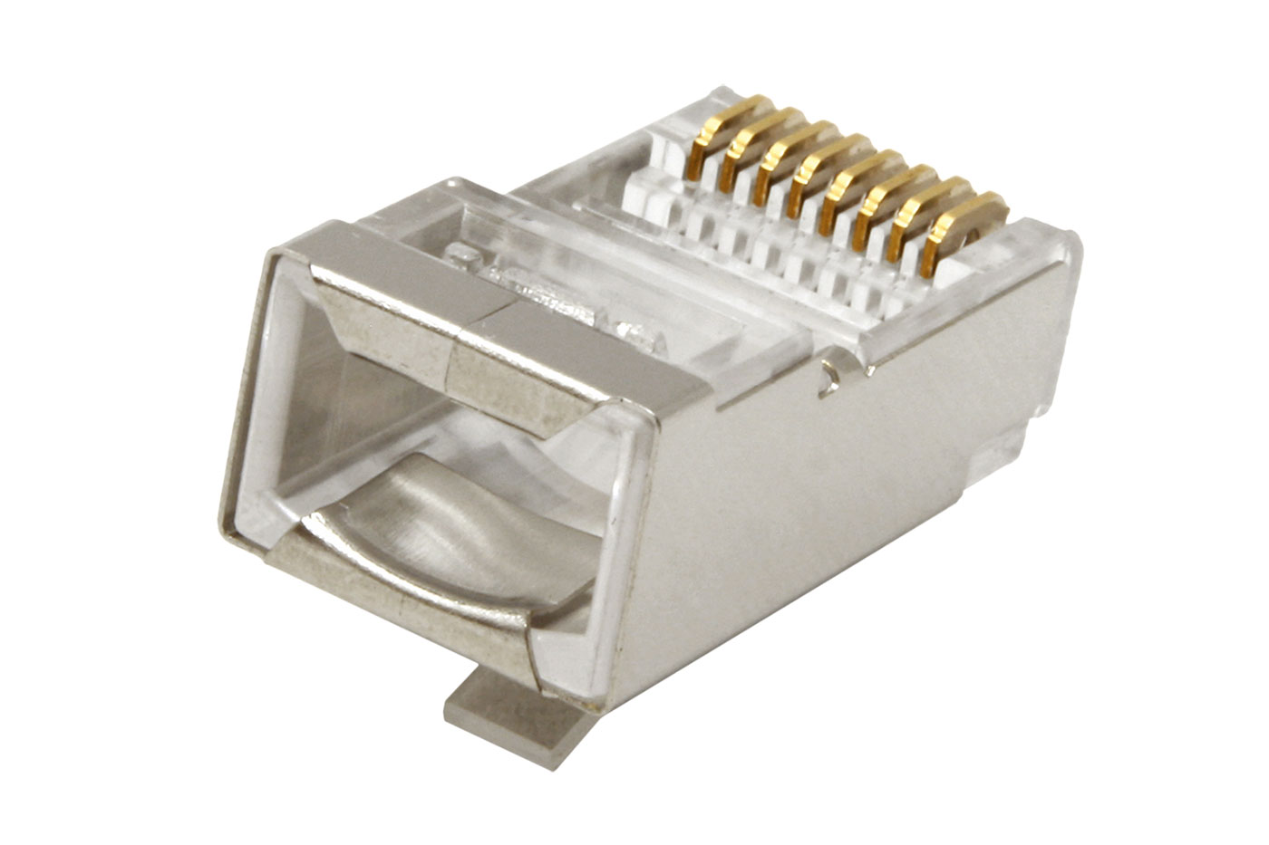 Stíněný konektor určený k nalisování (krimpování) na kulatý kabel. 8 pozic 8 kontaktů. Kategorie 5e.