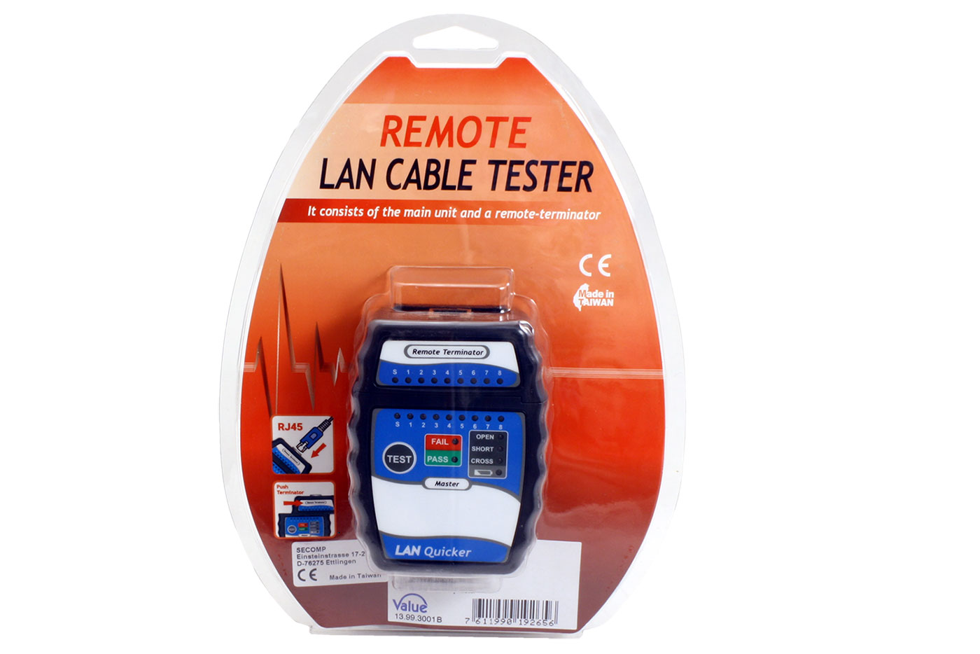 Tester pro kabely s konektory RJ45.Umožňuje provést rychlou kontrolu zapojení kabeláže počítačové sítě....